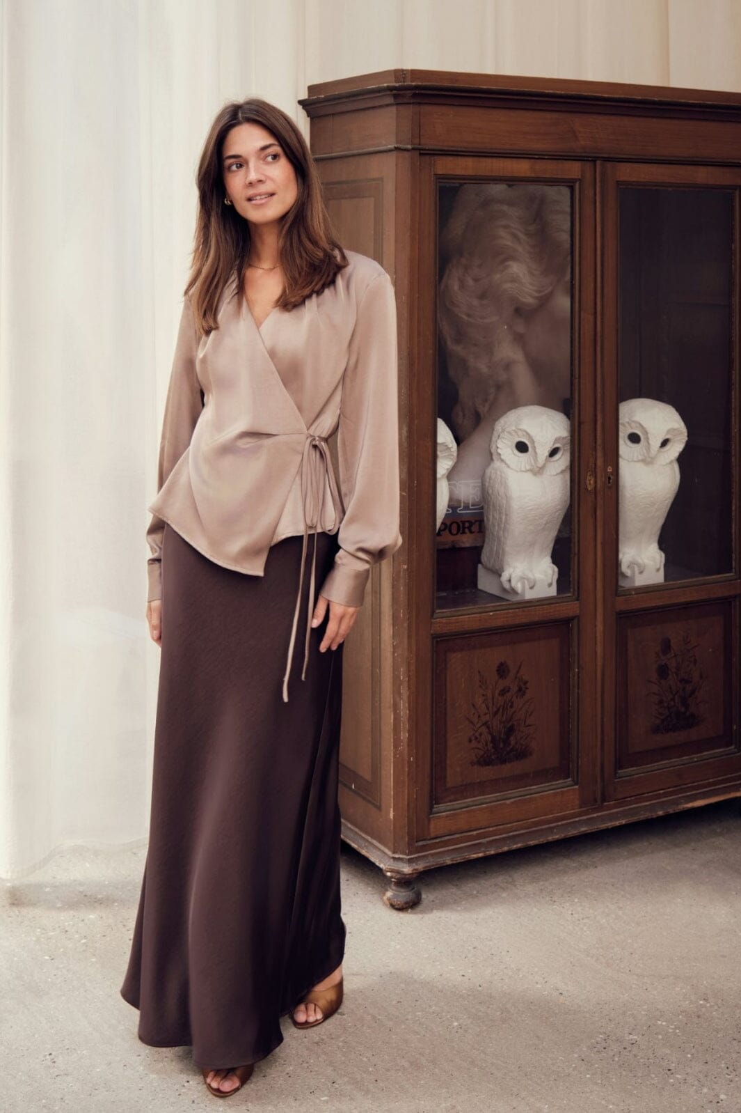 Satinowa bluzka od Neo Noir w ciemnym taupe. Bluzka ma luźny krój z designem kopertowym i wiązaniem z boku.