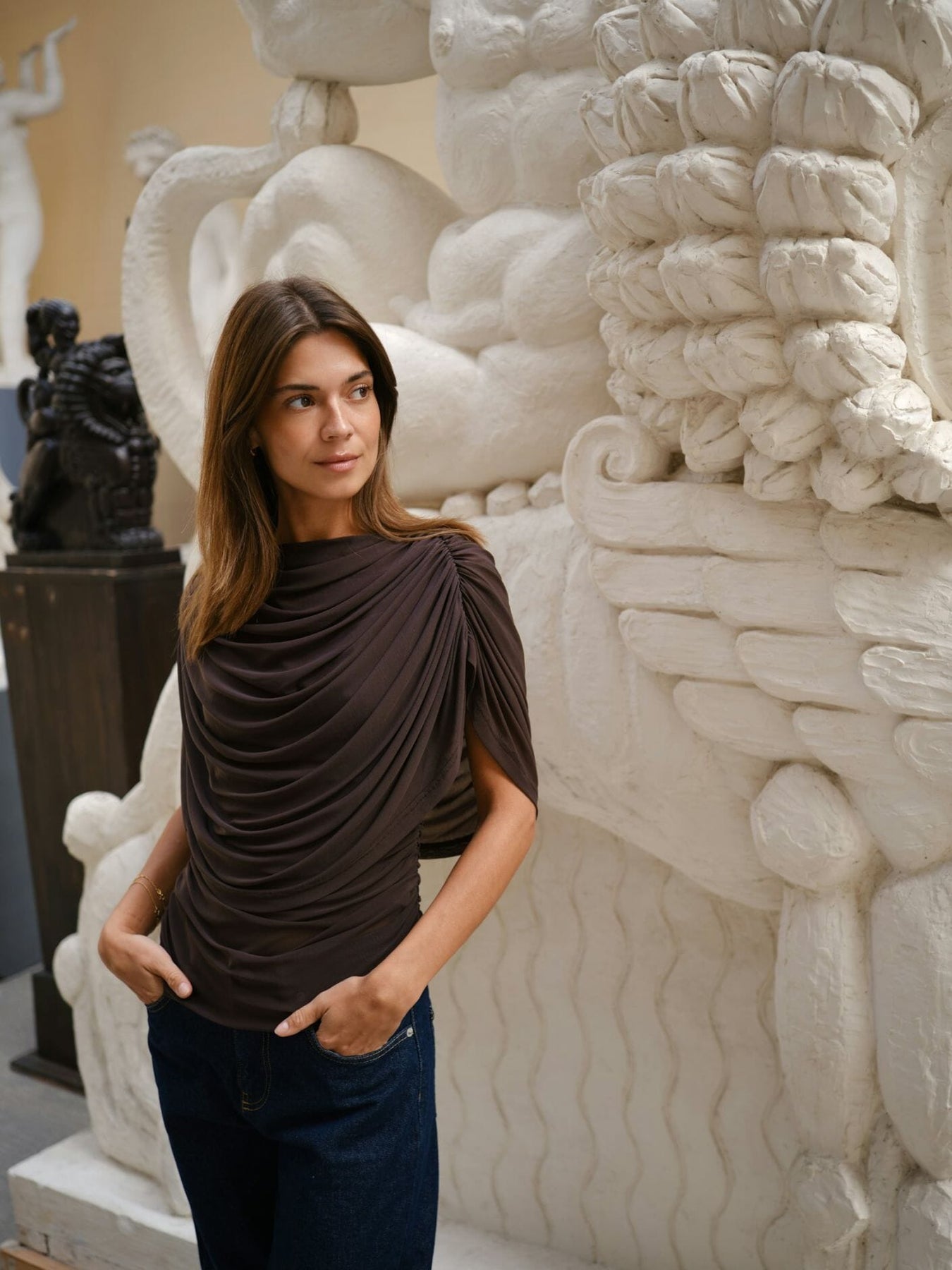 Brązowy top z siateczki od Neo Noir z drapowanym designem. Top ma przezroczysty materiał z detalami marszczenia wzdłuż szwu bocznego i drapowaniem z przodu.