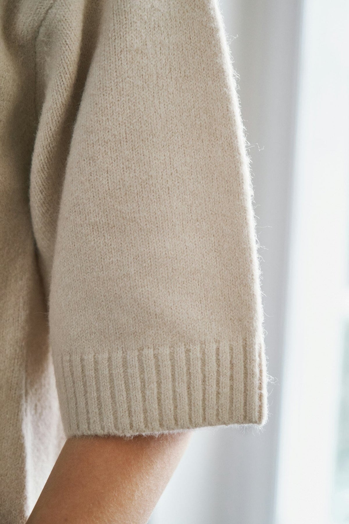 Sweter od Neo Noir w kolorze kości słoniowej. Sweter ma kołnierzyk polo i krótkie rękawy z ściągaczem. Guziki z przodu nadają swetrowi klasyczny wygląd.
