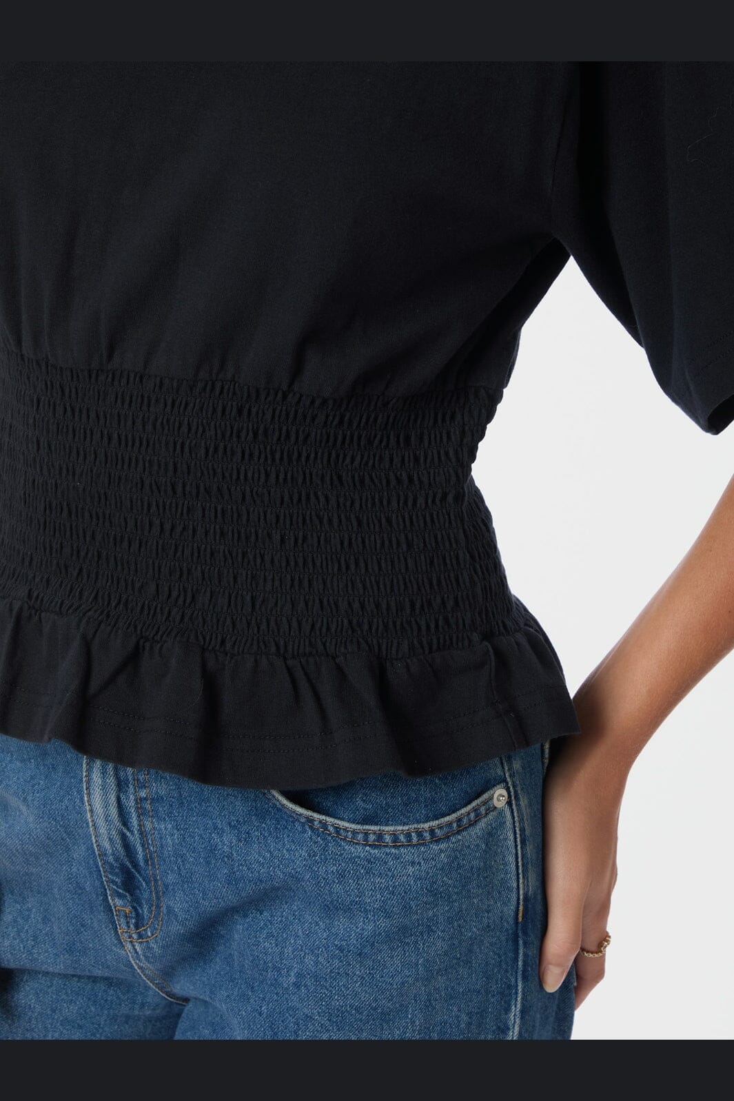 Granatowa koszulka od Neo Noir o luźnym kroju i detalu smock w talii. Wykonana jest z miękkiej bawełny i ma krótkie rękawy oraz okrągły dekolt.