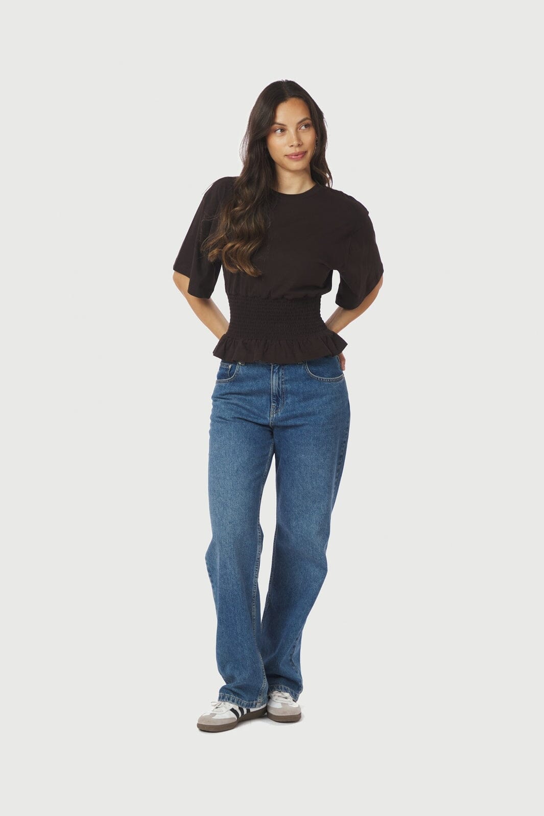 Ciemnobrązowy t-shirt od Neo Noir o luźnym kroju i detalu smock w talii. Okrągły dekolt i krótkie rękawy nadają t-shirtowi czysty i prosty wygląd.