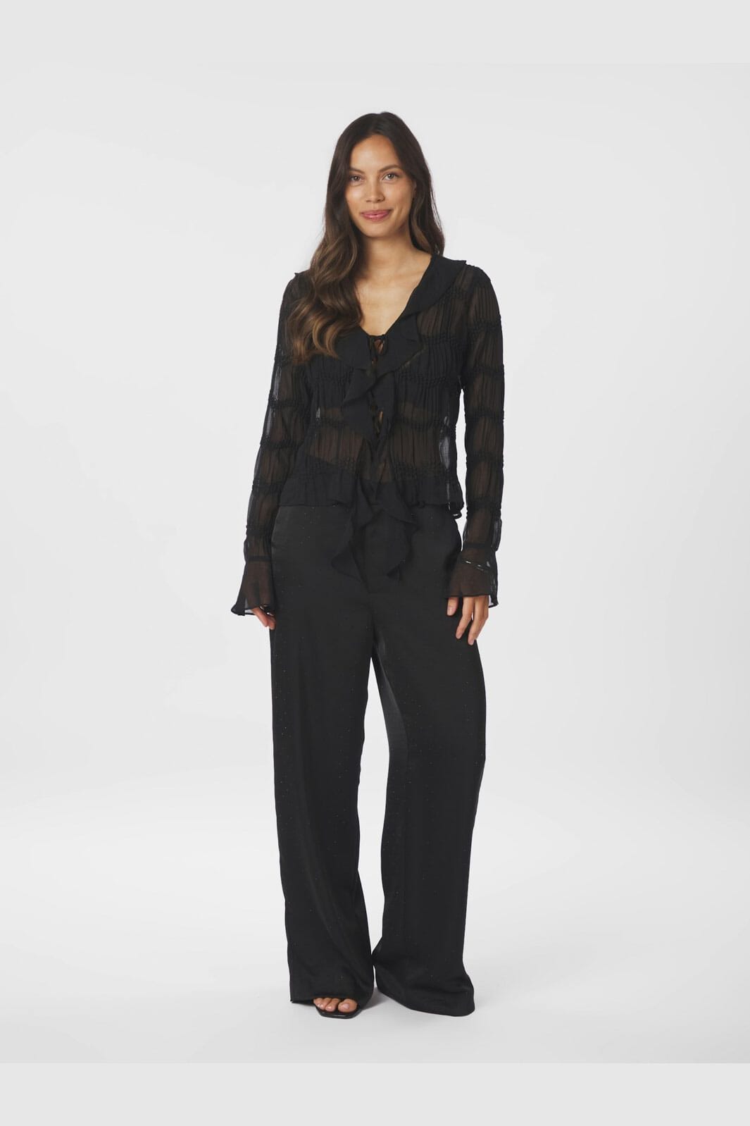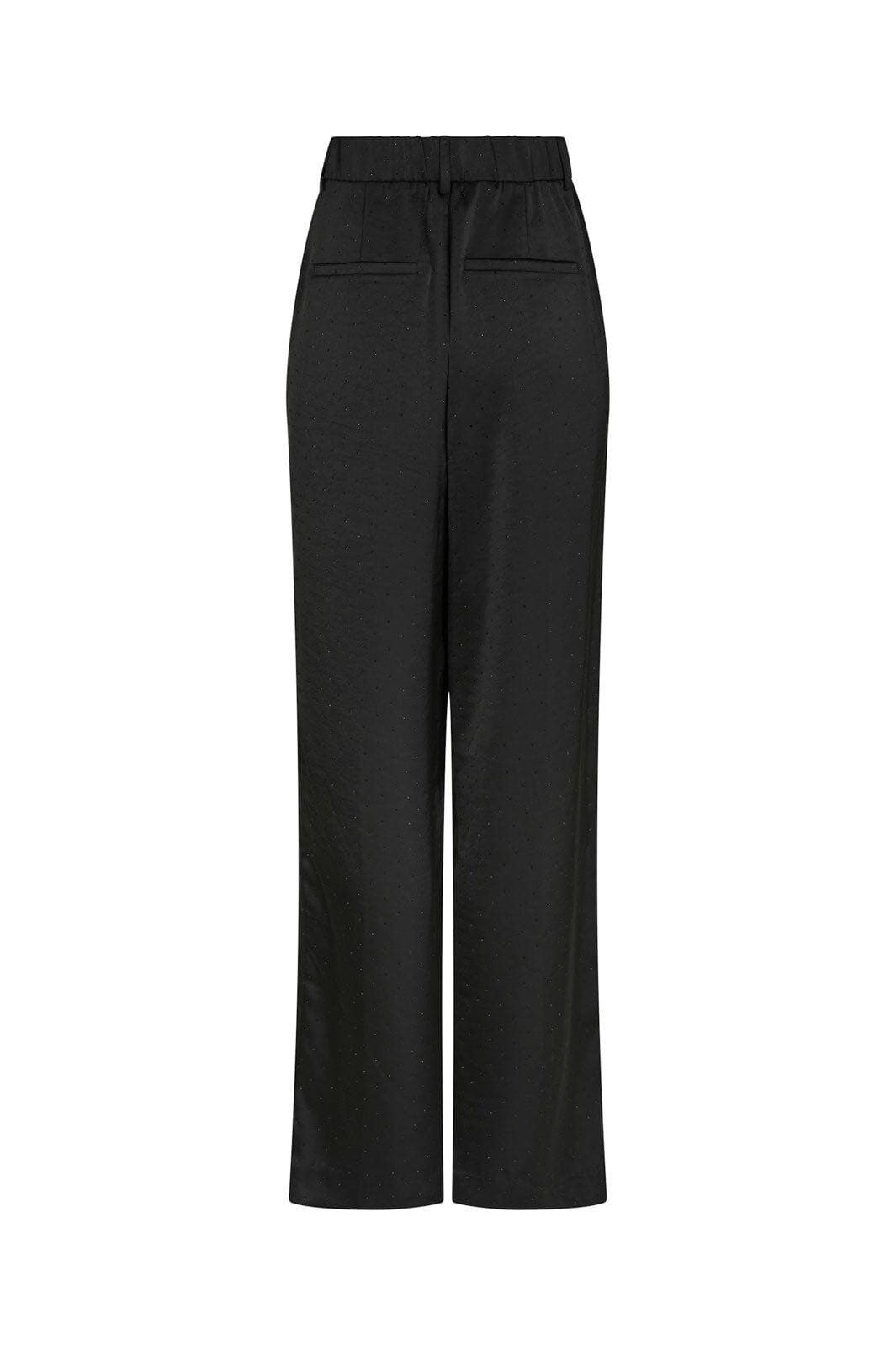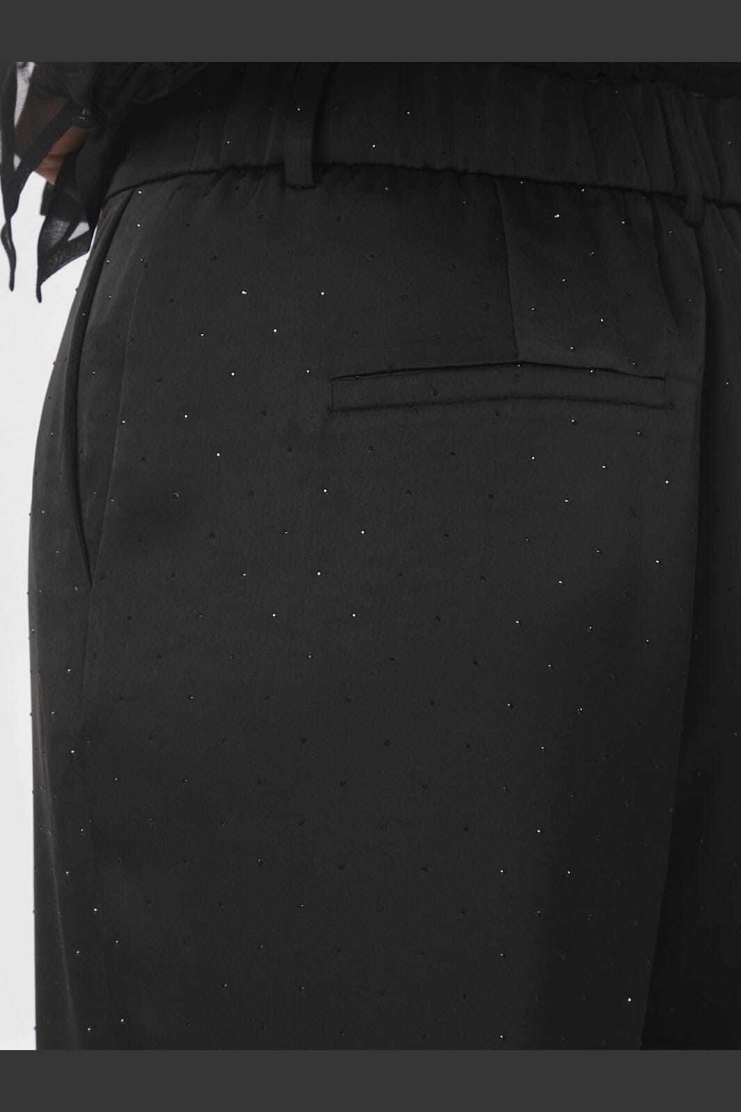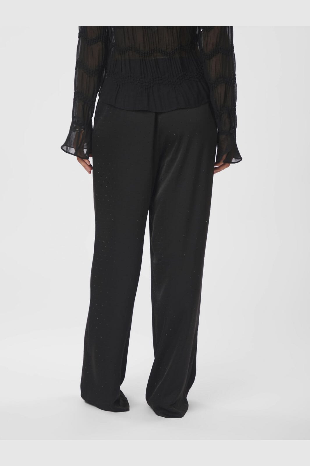 Czarne spodnie od Neo Noir z ciężkiego satynu z naszytymi kamieniami. Spodnie mają wysoki stan i luźny krój, który sięga aż do podłogi.