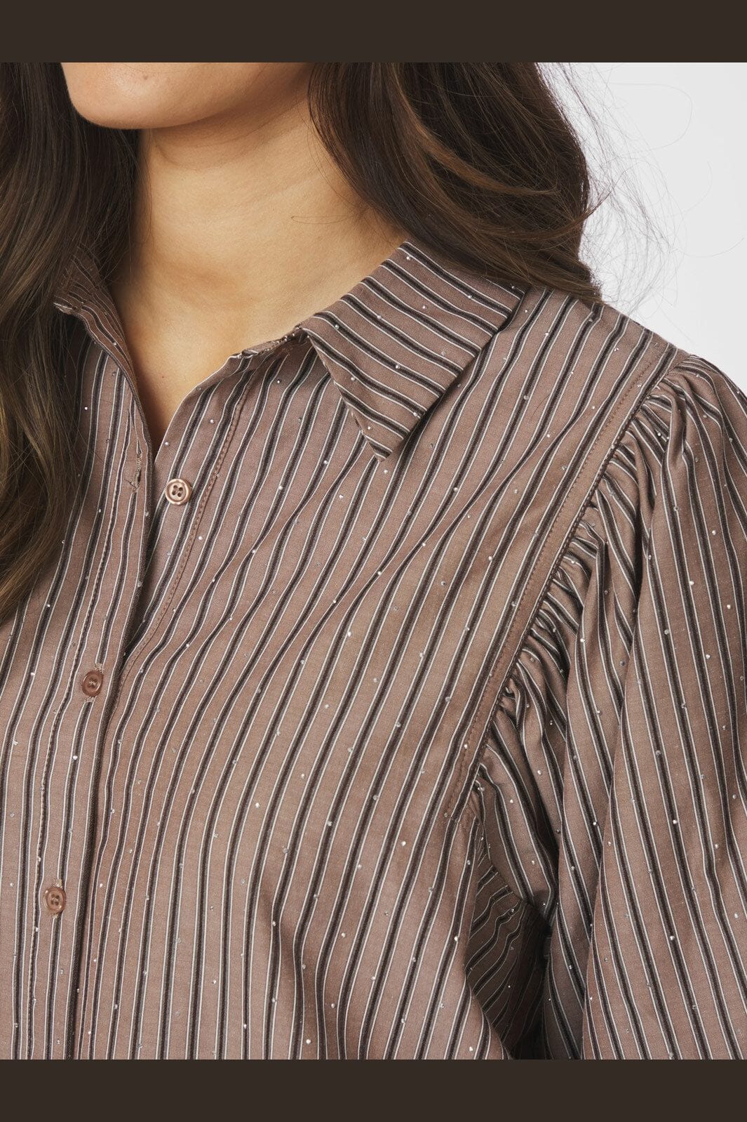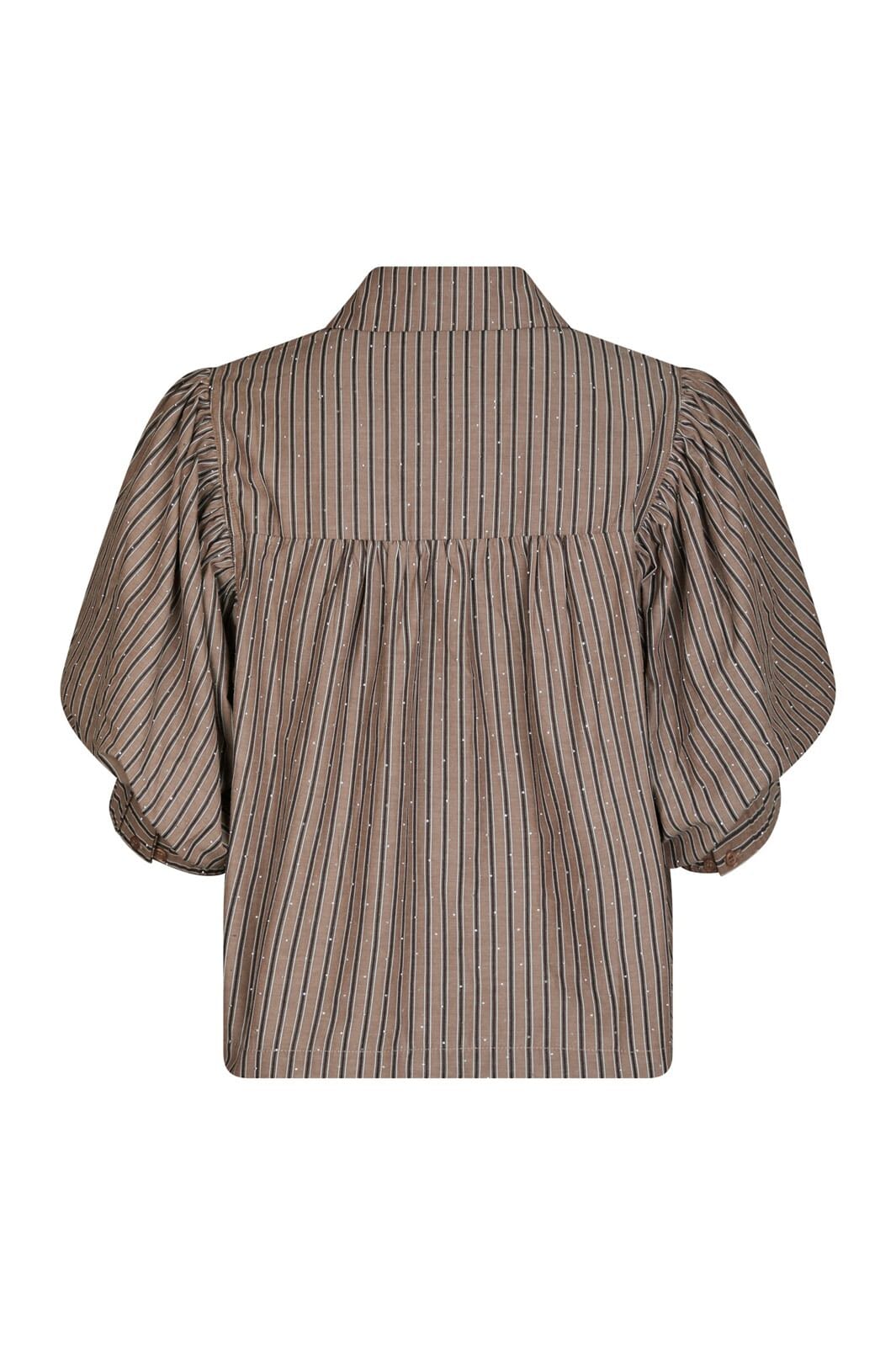 Brązowo-paskowana koszula od Neo Noir z krótkimi bufkami. Koszula ma pionowe paski w odcieniach brązu, dekoracyjne szwy oraz falbany, które nadają jej osobisty charakter.