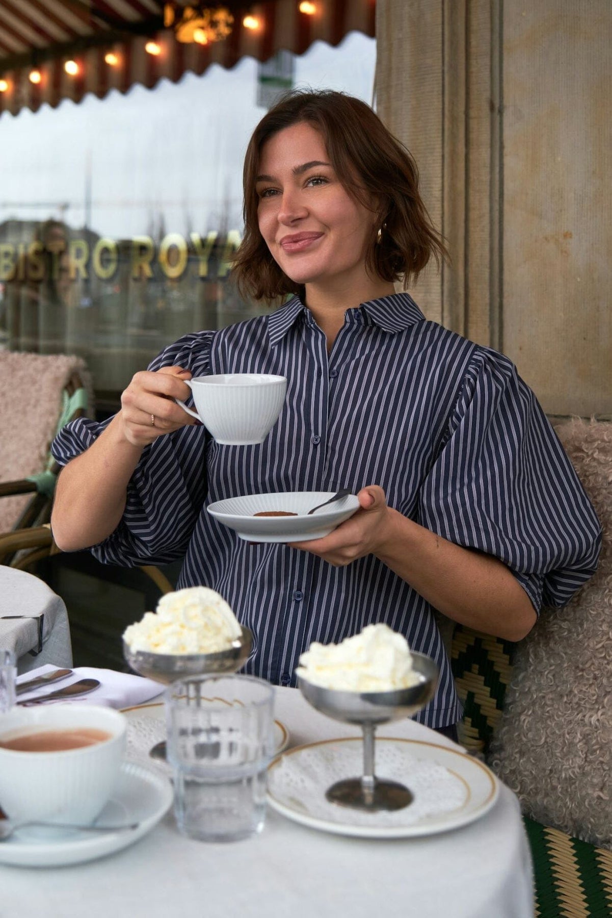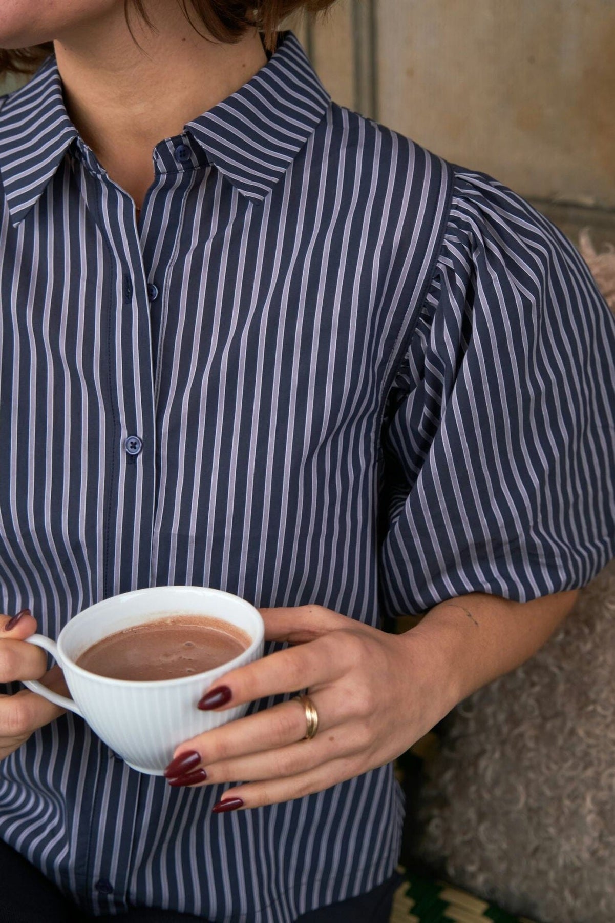 Ciemnoniebieska w paski koszula od Neo Noir z krótkimi bufkami. Koszula ma pionowe paski w ciemnoniebieskim i białym kolorze, klasyczny kołnierzyk i zapięcie na guziki z przodu.