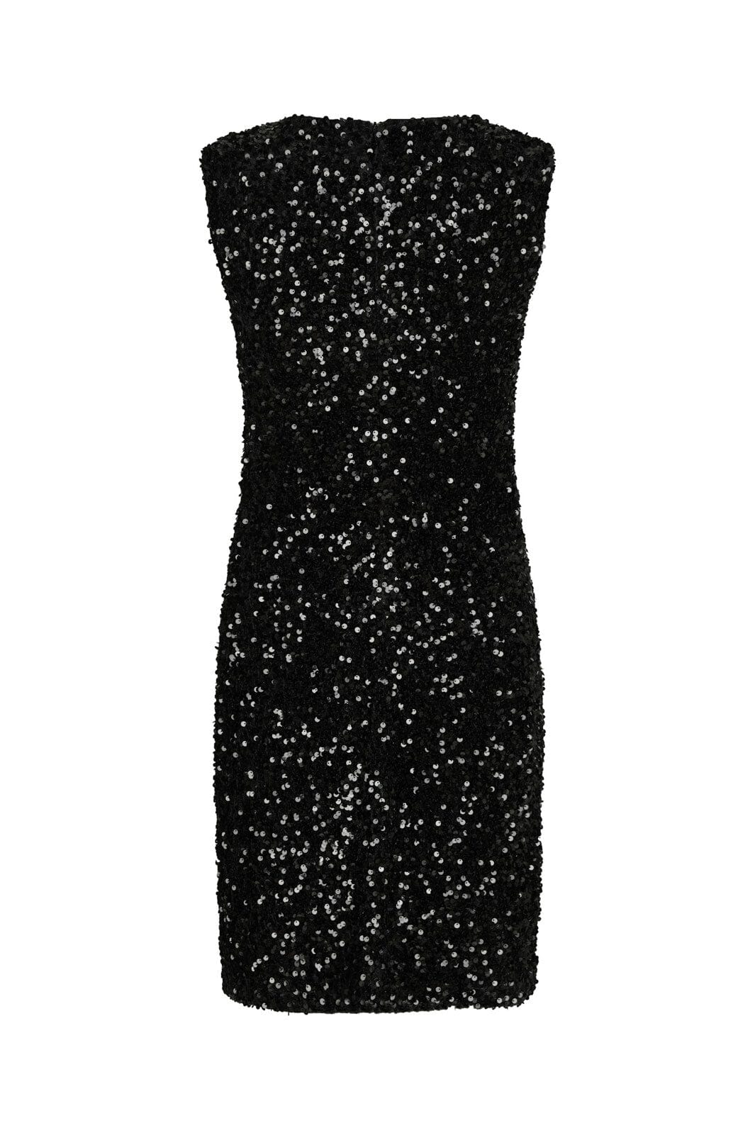 Czarna sukienka z weluru od Neo Noir z cekinami na całej sukience. Dopasowana sukienka ma okrągły dekolt i jest bez rękawów. Zamek błyskawiczny z tyłu ułatwia jej zakładanie.