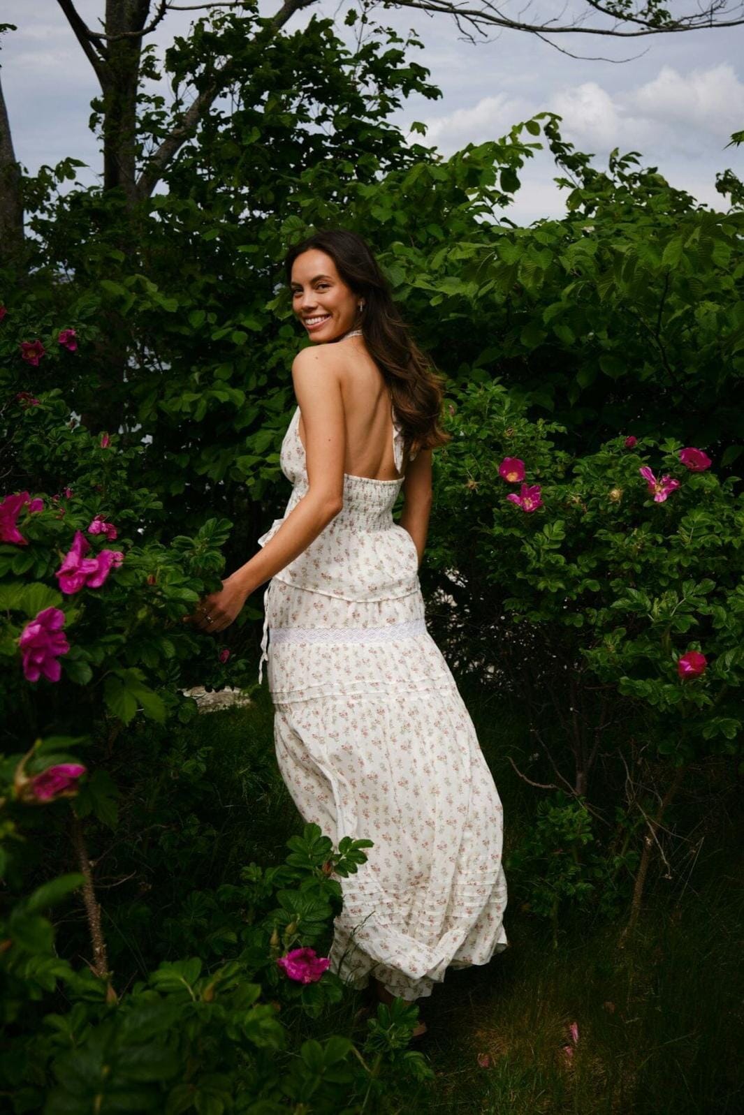 Długa spódnica od Neo Noir w kremowym kolorze z małymi różowymi kwiatami. Spódnica ma falbany i zakładki, które nadają ruchu materiałowi, a także elastyczną talię z wiązaniem.