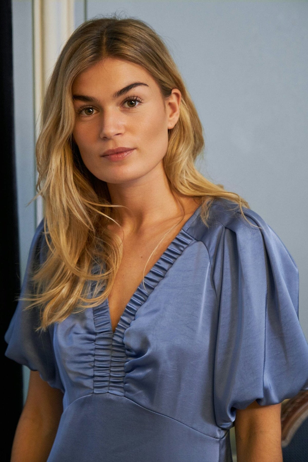 Dymnoniebieska satynowa sukienka marki Neo Noir, wykonana z ciężkiego materiału satynowego. Sukienka ma krótkie bufiaste rękawy oraz dekolt w kształcie litery V z marszczonymi detalami.