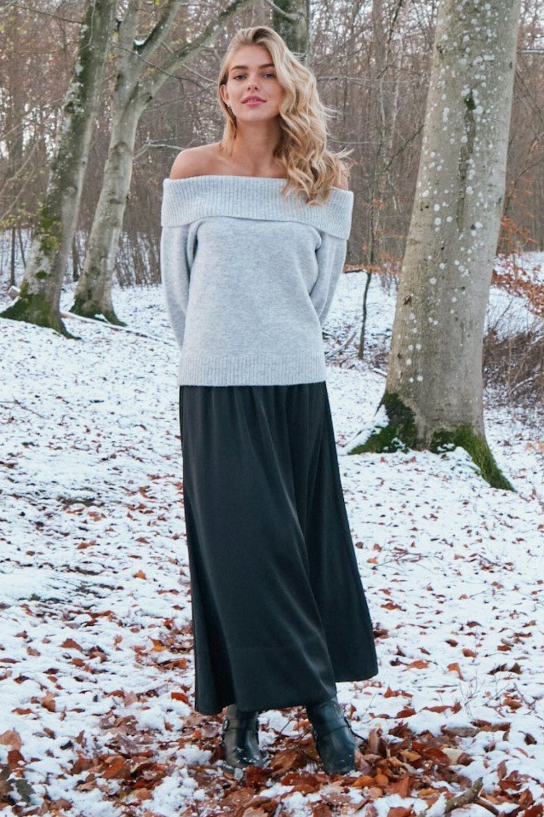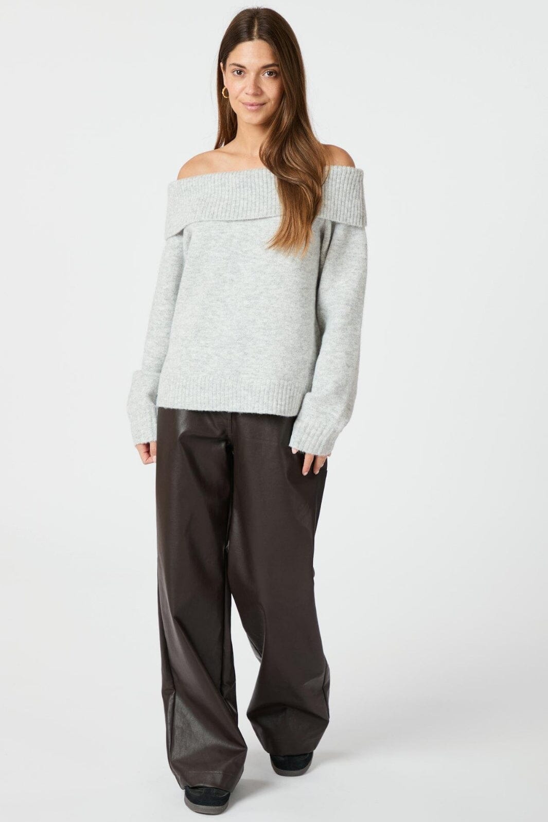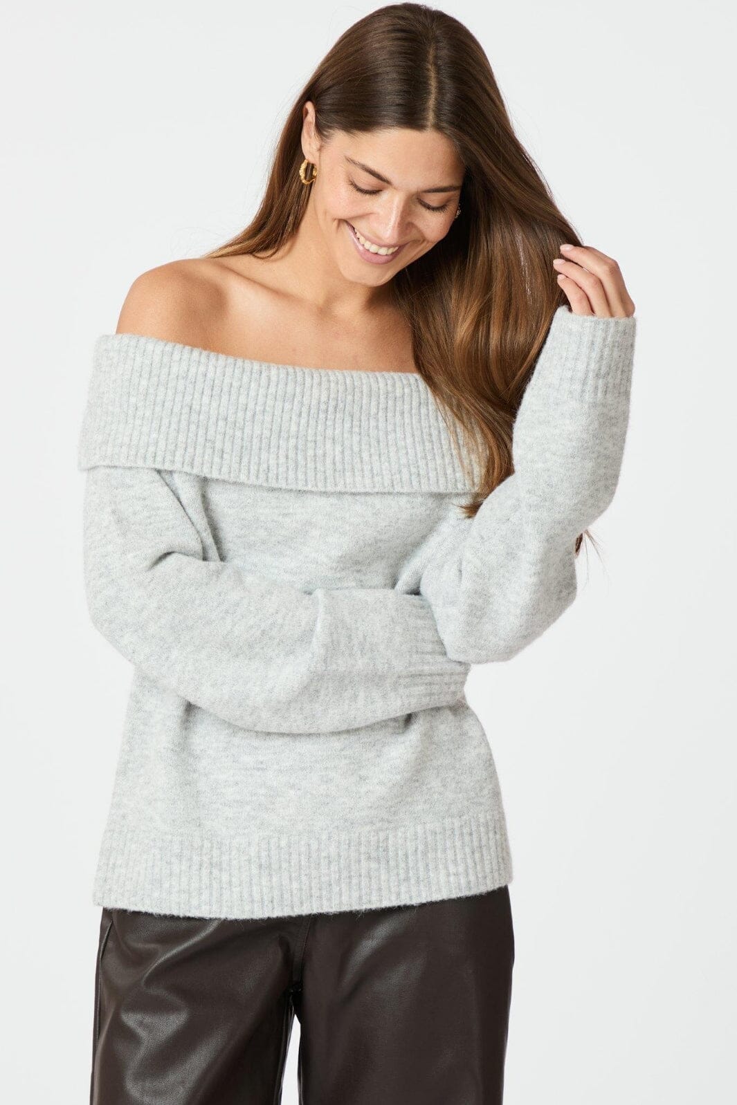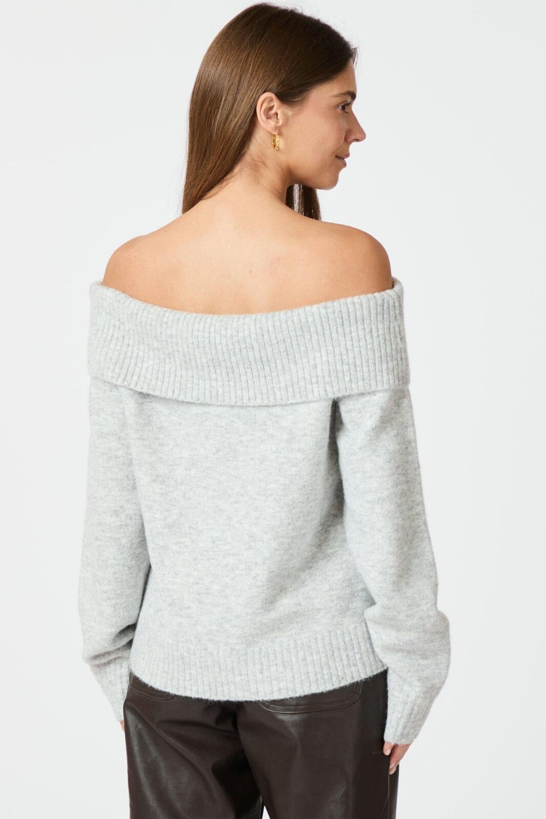 Jasnoszara sweter od Neo Noir z dekoltem off-shoulder. Sweter ma melanzową powierzchnię i luźny krój, co ułatwia stylizację.