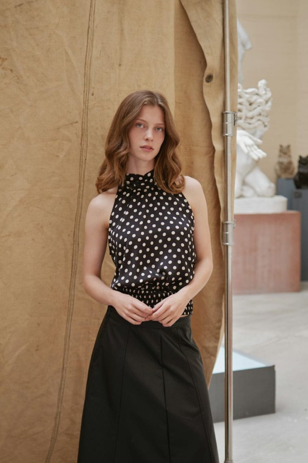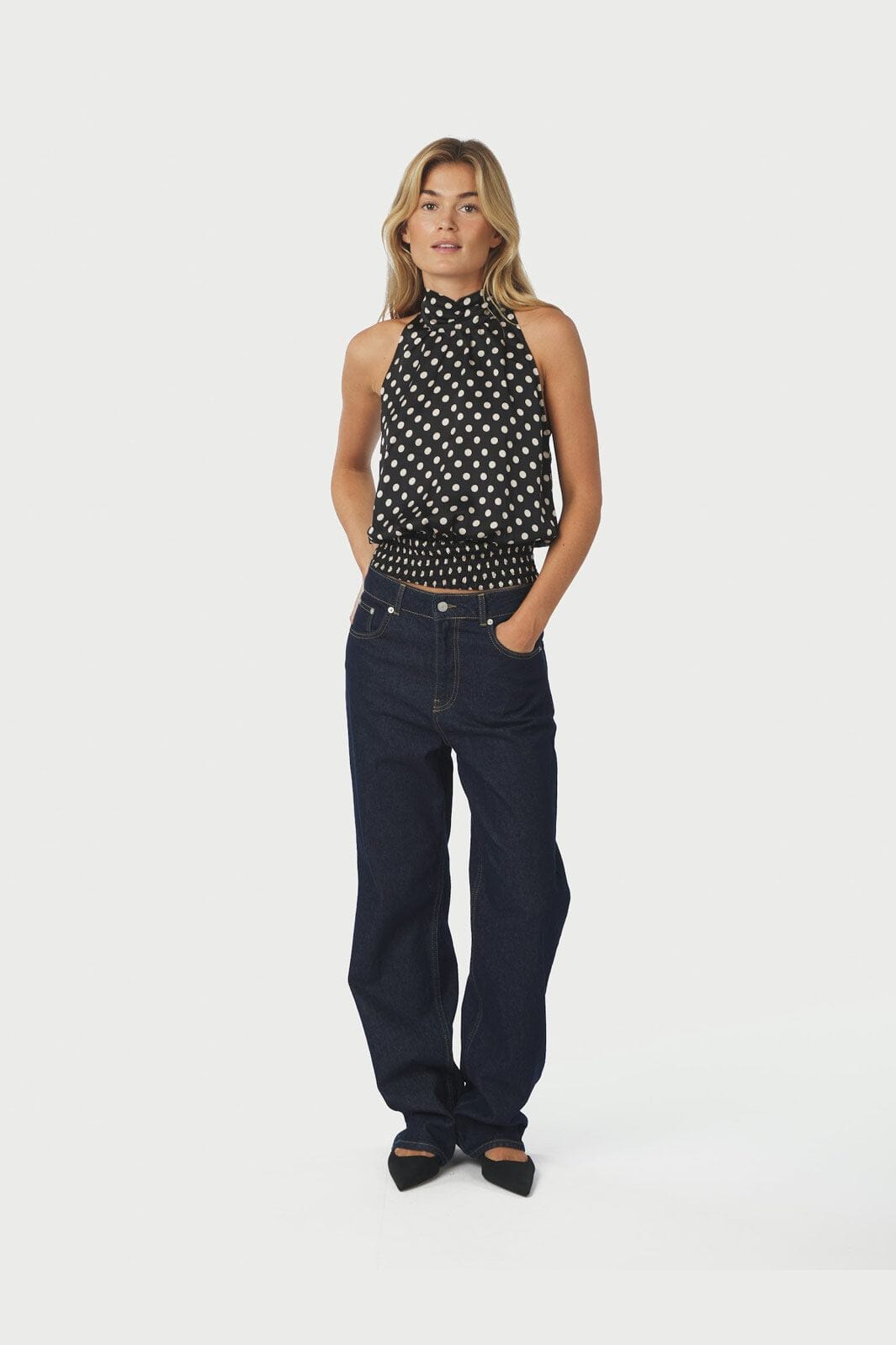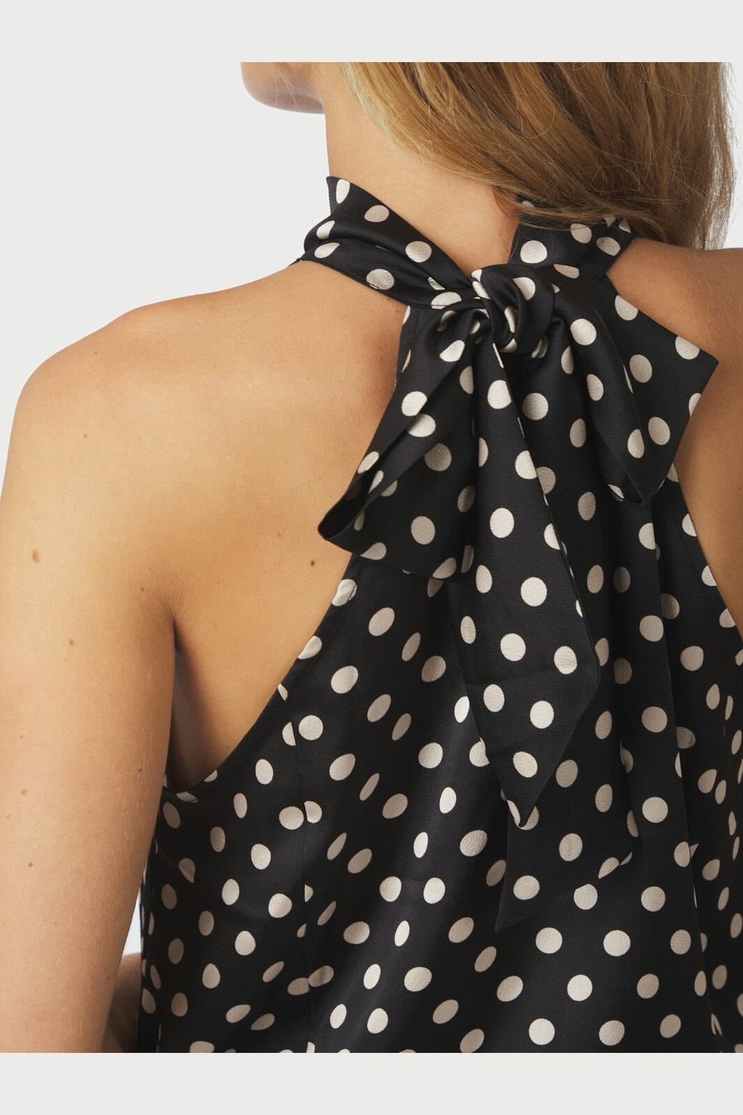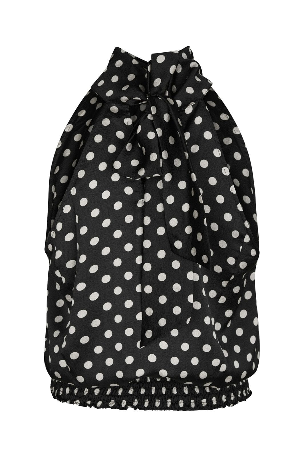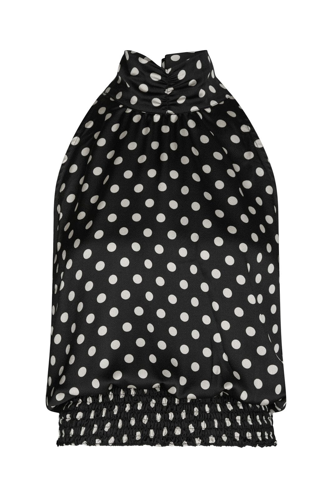 Czarny top od Neo Noir w białe kropki. Top ma wysoki dekolt i projekt halterneck z wiązaniem. Szczegóły smock na dole zapewniają dobrą dopasowanie.