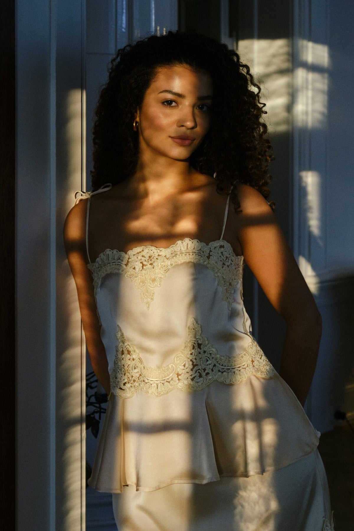 Jasnożółty top marki Neo Noir, wykonany z ciężkiego atłasu z koronkowymi detalami. Top ma cienkie wiązane ramiączka na ramionach i lekko rozszerzany dół.