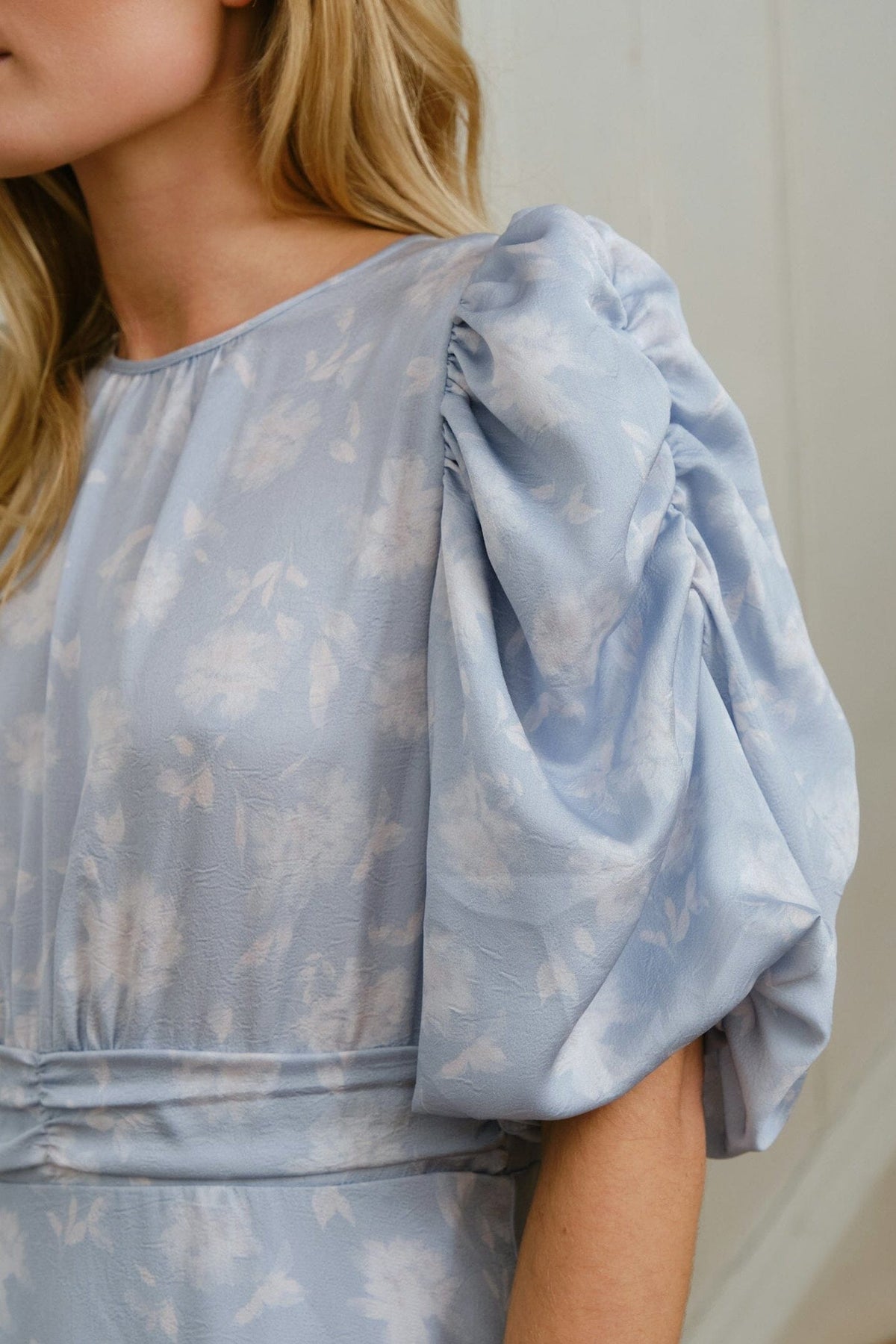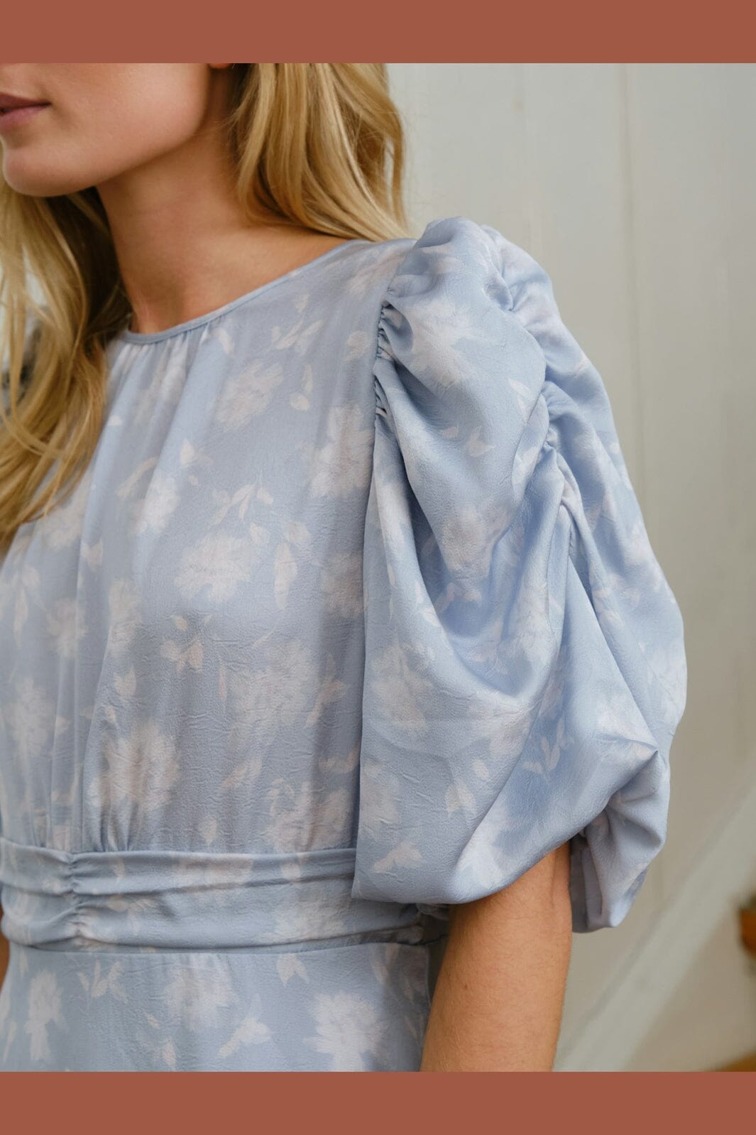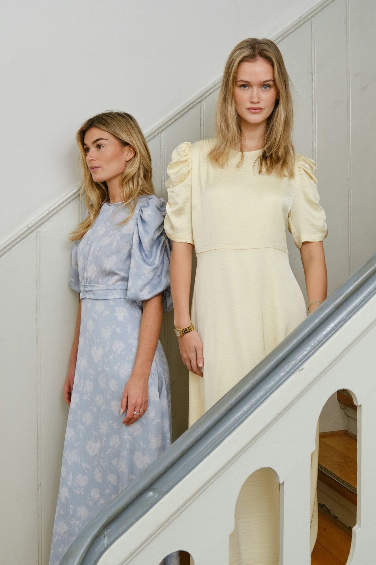 Długa sukienka Neo Noir w jasnoniebieskim odcieniu z kwiatowym nadrukiem. Sukienka ma rękawy 3/4, okrągły dekolt i dekoracyjne przeszycia.