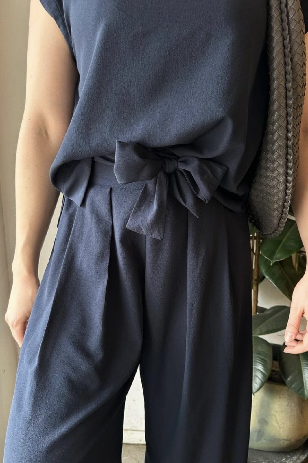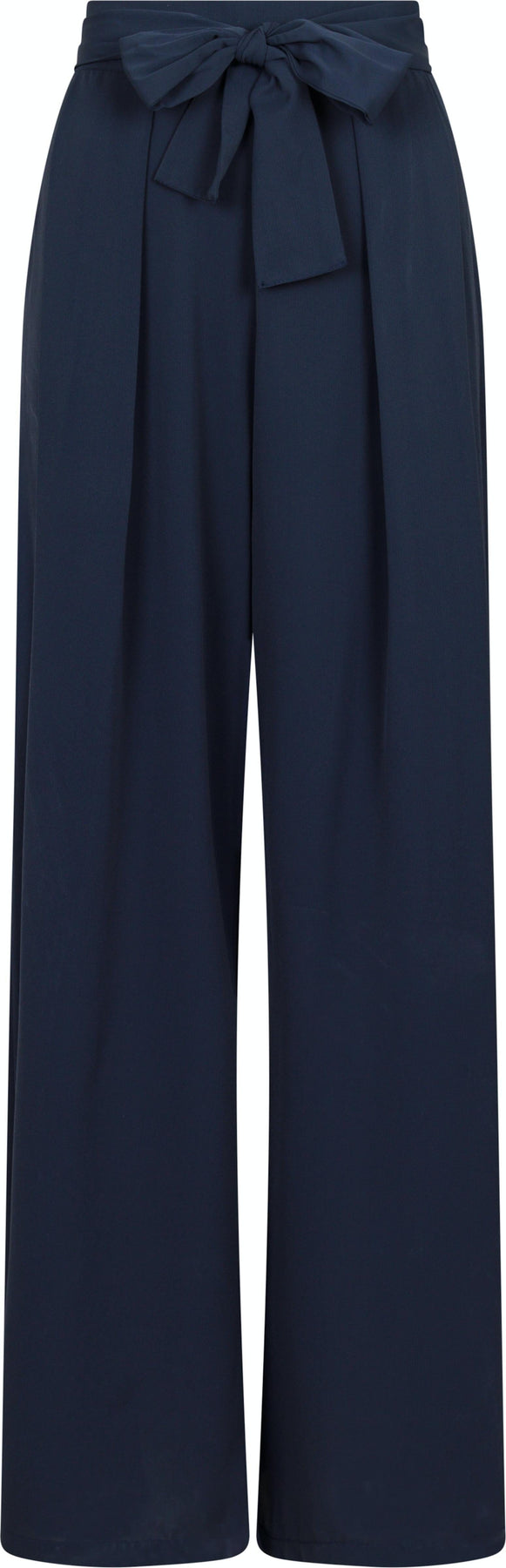 Granatowe spodnie od Neo Noir z detalami w postaci kokardek. Spodnie mają wysoki stan z wiązaniem i gumką, co zapewnia dobrą formę. Zaprojektowane w długości do kolan z regularnym krojem.