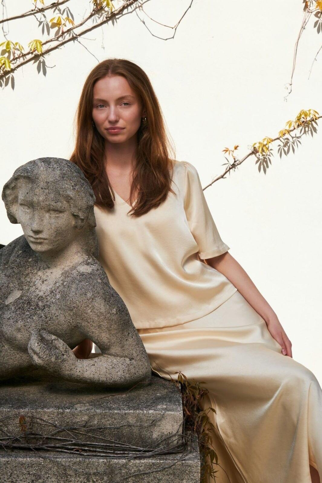 Jasnożółta bluzka od Neo Noir w jakości satynowej. Bluzka ma krótkie rękawy, poduszki na ramionach i dekolt w kształcie litery V. Satynowy materiał nadaje błyszczący wygląd, który pasuje zarówno na co dzień, jak i na imprezy.