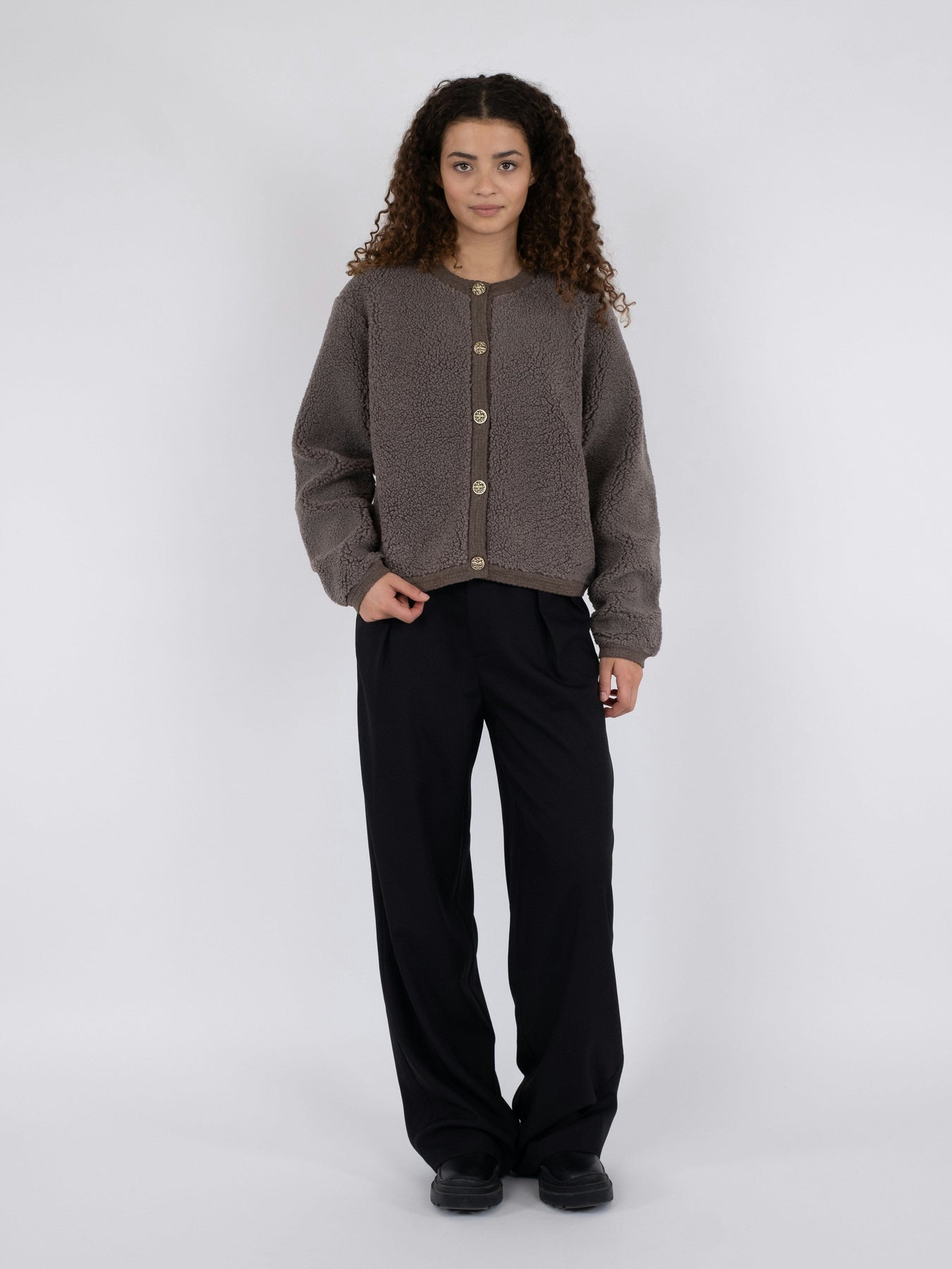 Sweter kardigan od Neo Noir w stonowanym kolorze żelaza. Miękki, puszysty materiał ma okrągły dekolt i guziki z przodu, co ułatwia otwieranie i zamykanie.