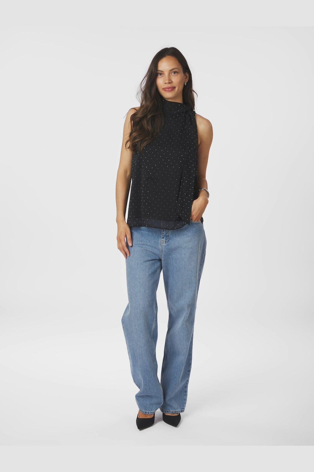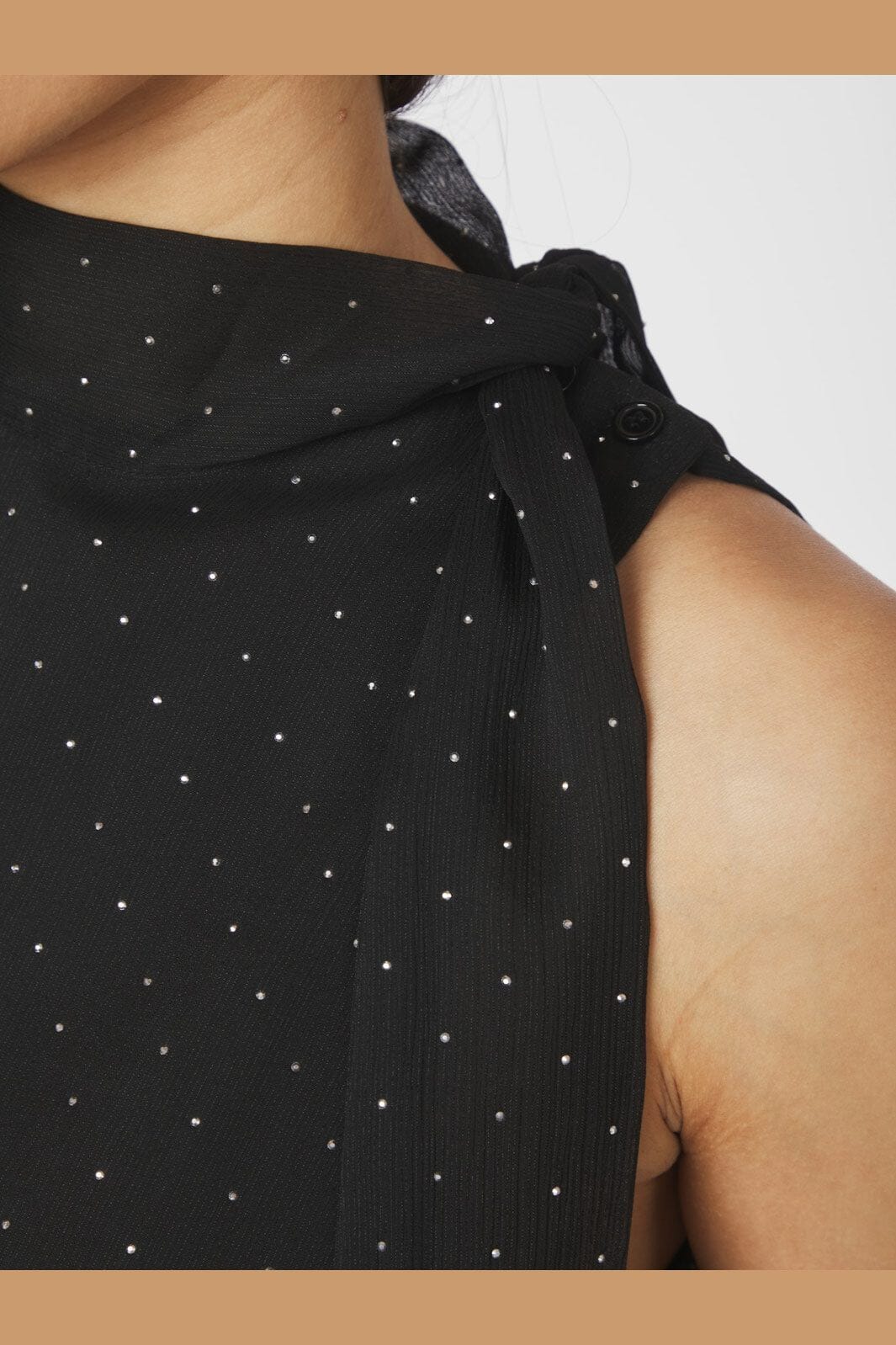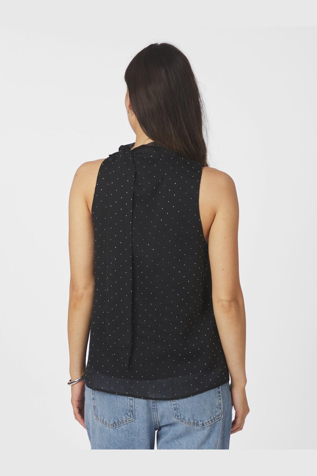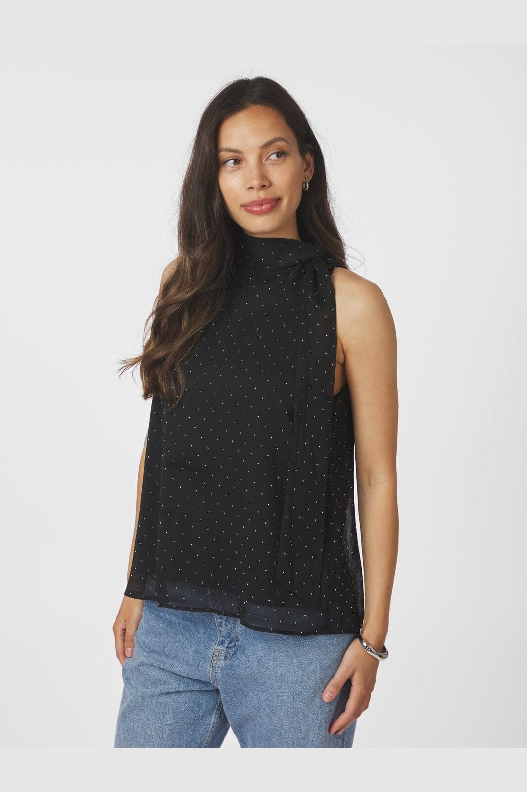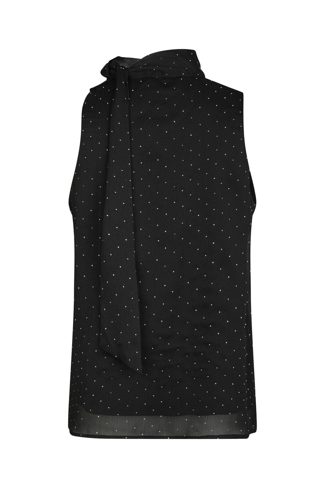 Czarny top od Neo Noir z białymi kropkami i wysokim kołnierzem. Top ma luźny krój i jest wykonany z szyfonu z naszytymi kamieniami oraz wiązaniem przy szyi.