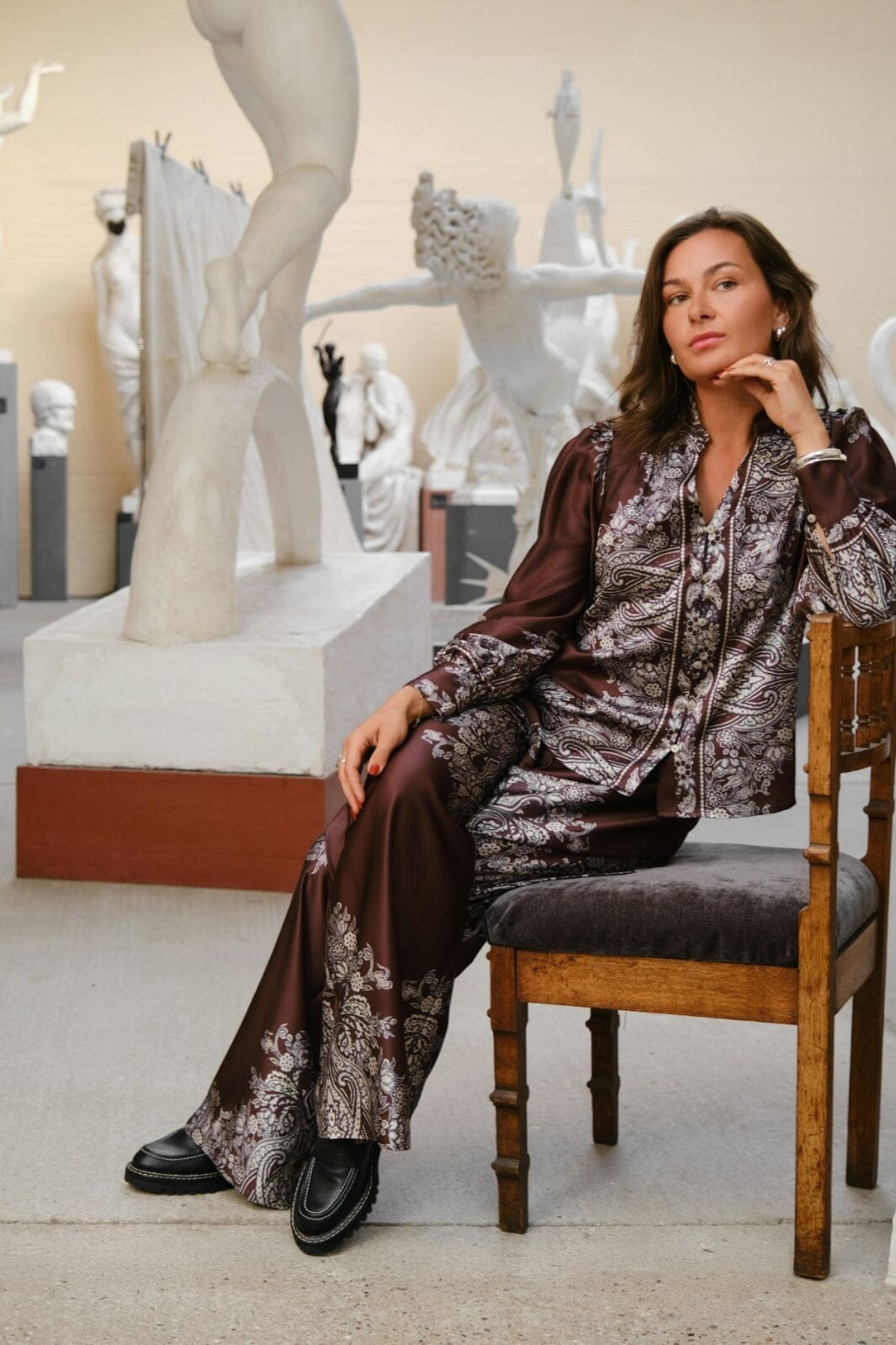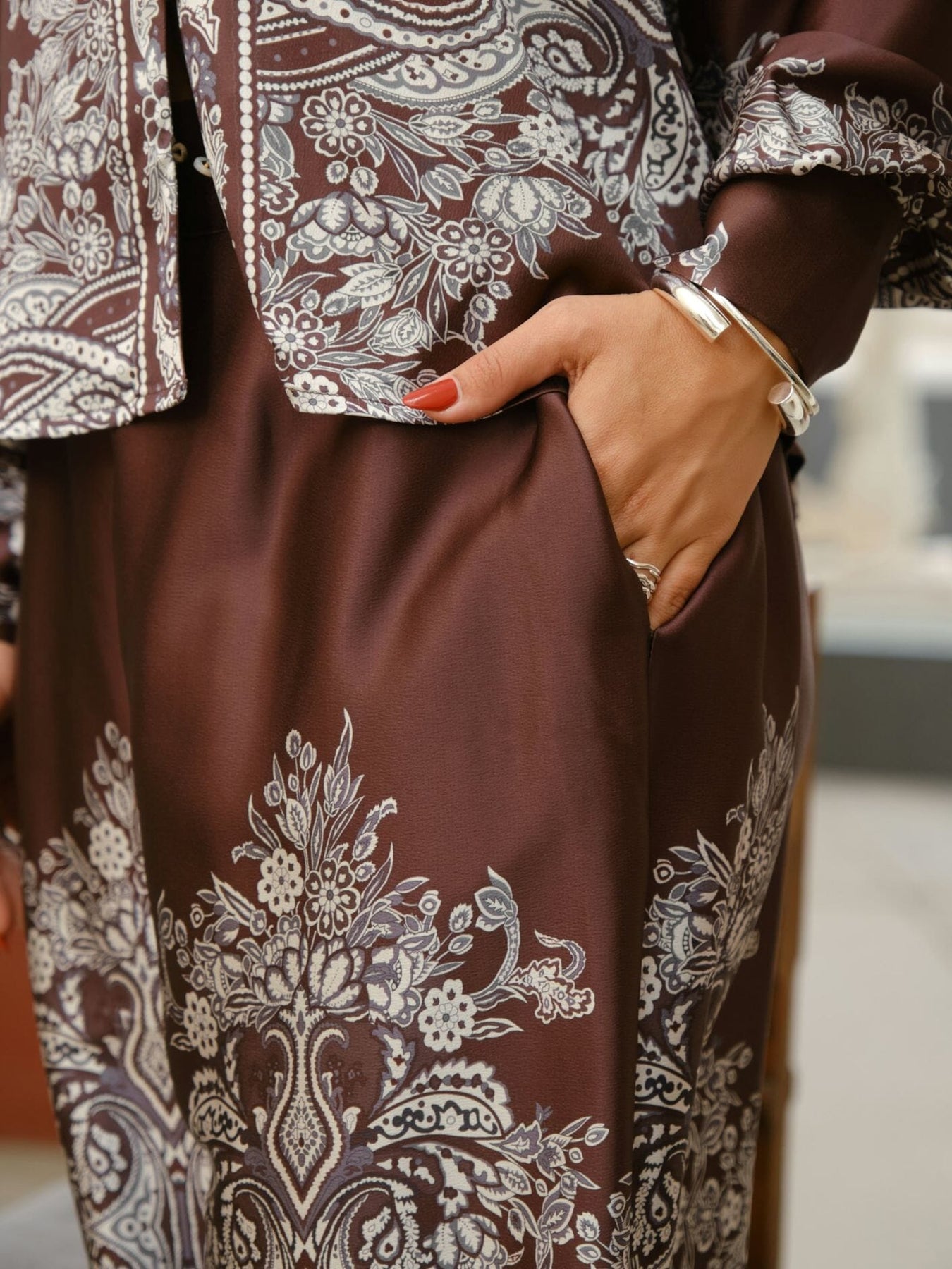 Ciemnobrązowe spodnie od Neo Noir z satyny w wzór paisley. Spodnie mają szerokie nogawki i sięgają do podłogi, z elastycznym pasem ułatwiającym zakładanie i zdejmowanie.