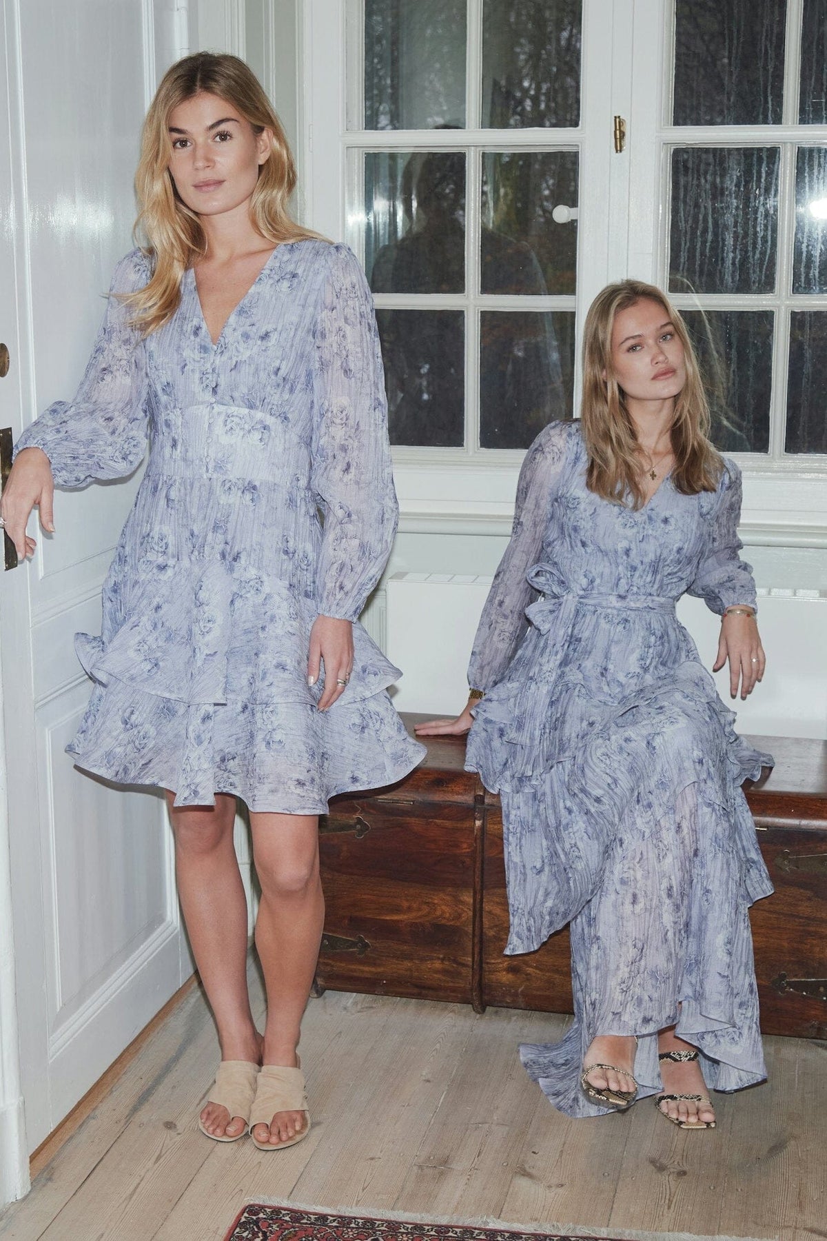 Sukienka Neo Noir z kwiatowym nadrukiem w jasnoniebieskim kolorze. Dzięki falbanom i dekoltowi w kształcie litery V sukienka sprawdzi się na co dzień, na uroczyste okazje oraz na wesela.