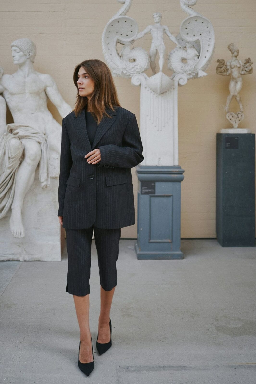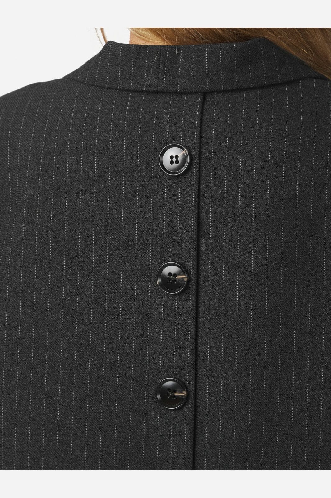 Blazer w kolorze antracytowym od Neo Noir z wzorem w prążki. Ma oversize'owy krój oraz guziki zarówno z przodu, jak i z tyłu. Dekolt w kształcie litery V i długie rękawy nadają blazerowi klasyczny fason.