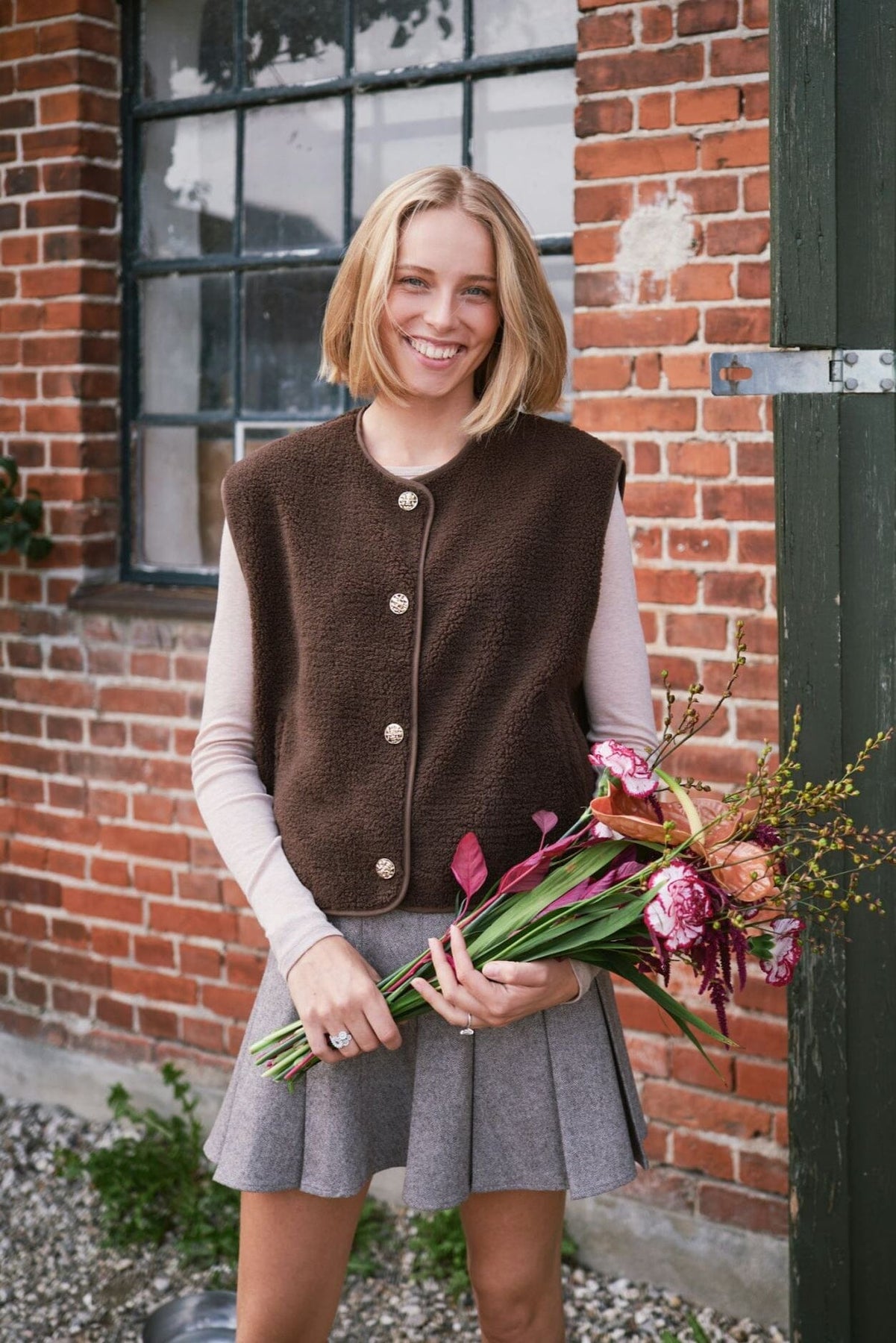 Ciemnobrązowa kamizelka teddy od Neo Noir z okrągłym dekoltem. Miękka i puszysta tekstura teddy nadaje kamizelce ciepły i przytulny wyraz.