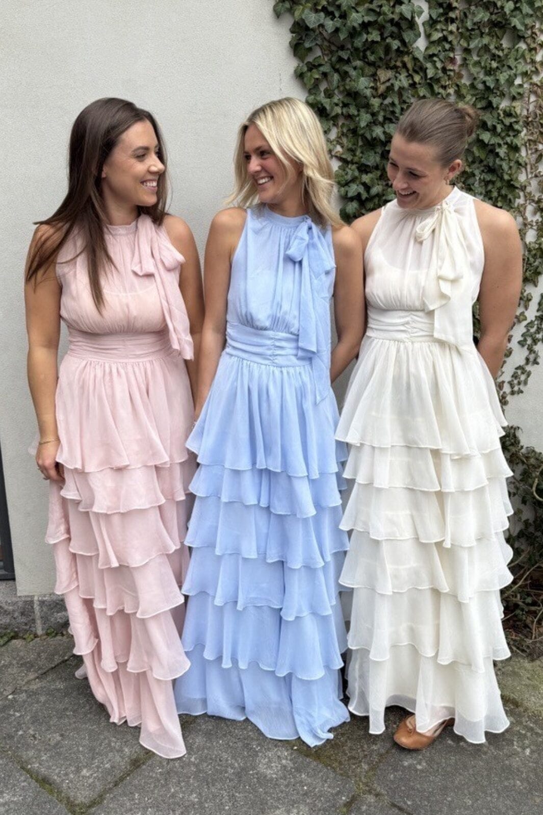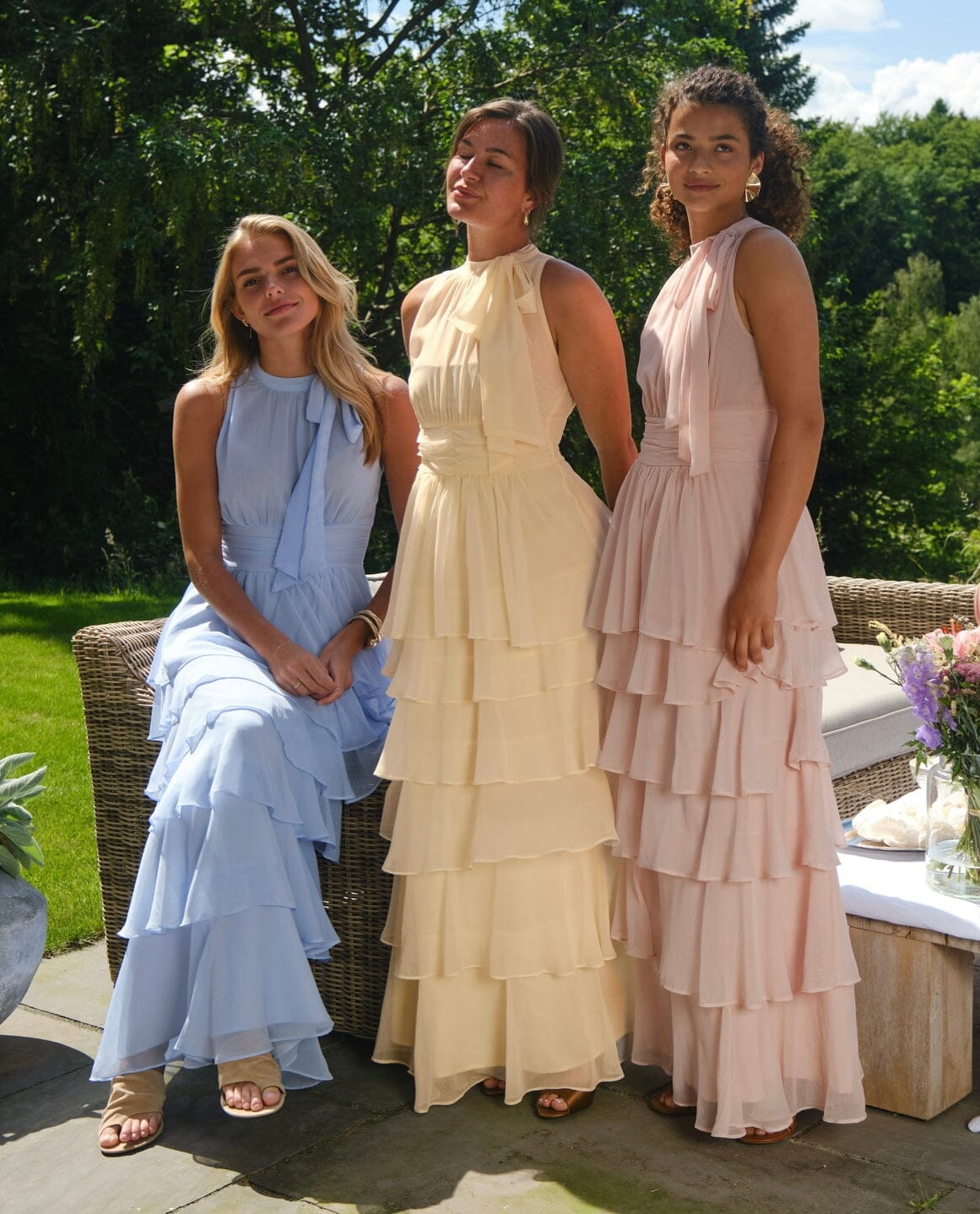 Długa sukienka z szyfonu od Neo Noir w kolorze różowym. Sukienka ma warstwowy design z falbanami i szeroką wstążkę przy wysokim dekolcie.