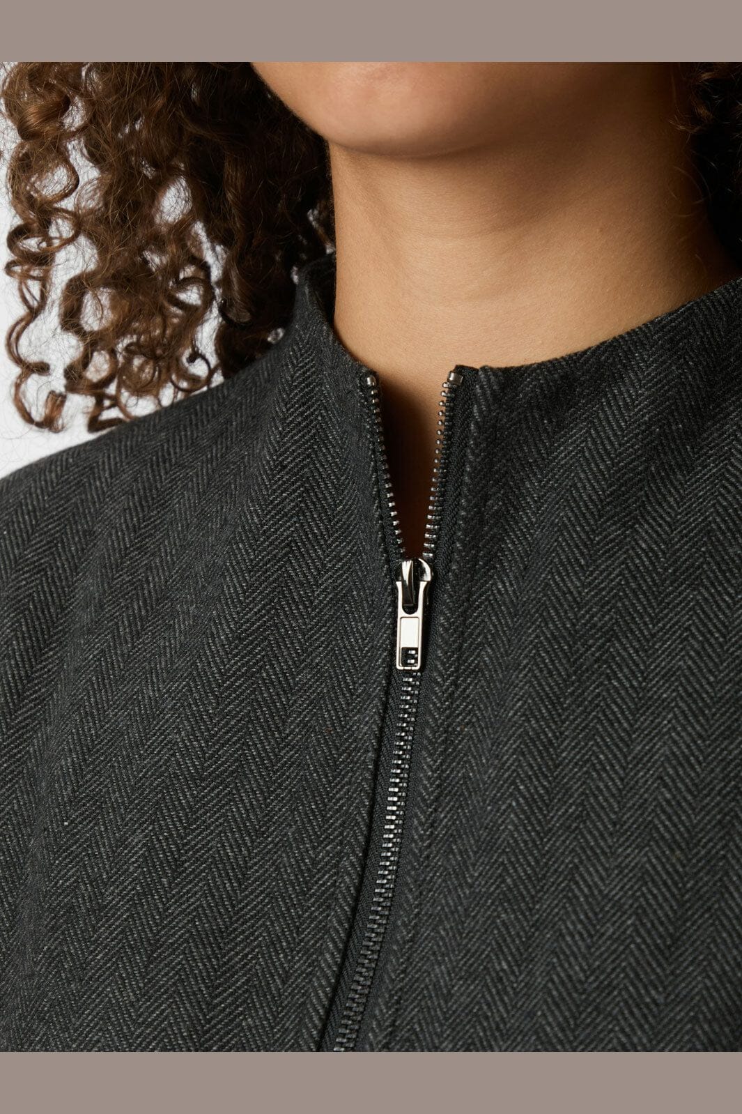 Bezramienna sukienka od Neo Noir w antracytowym materiale z wzorem w jodełkę. Sukienka ma wysoki kołnierz i praktyczny zamek błyskawiczny z przodu. Nadaje się zarówno na co dzień, jak i na imprezy.