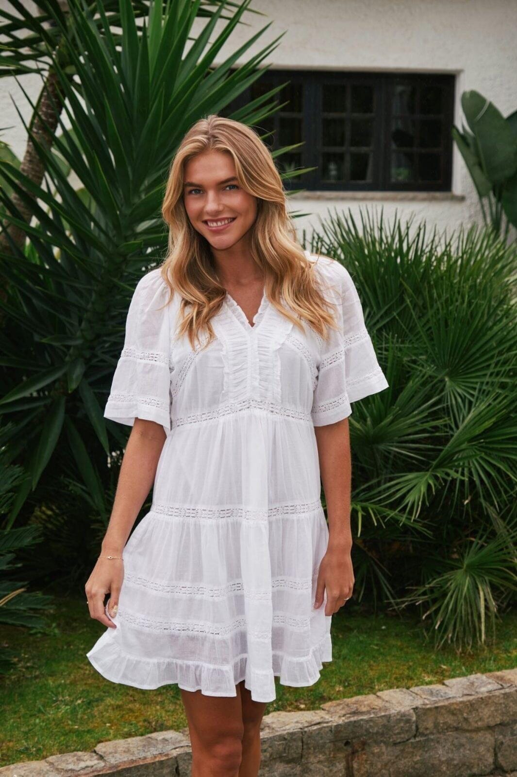 Biała sukienka z woalu od Neo Noir z koronkowymi wstawkami i detalami w falbanki. Sukienka ma krótkie rękawy i dekolt w kształcie V z marszczonymi detalami wzdłuż szwów.