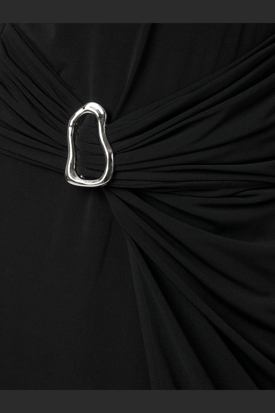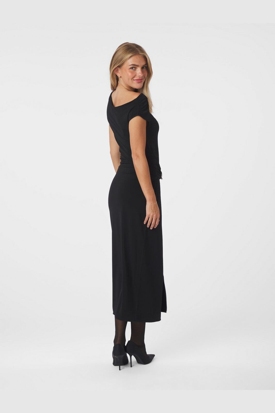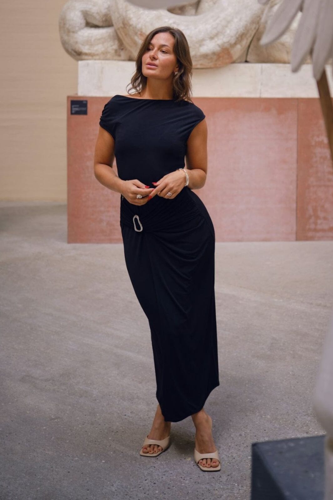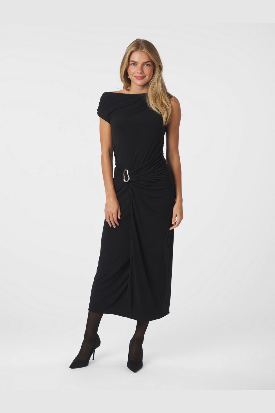 Czarna sukienka od Neo Noir z drapowaniem w talii i srebrną klamrą. Sukienka ma krótkie rękawy, okrągły dekolt i sięga do połowy łydki. Slim fit podkreśla linie ciała.