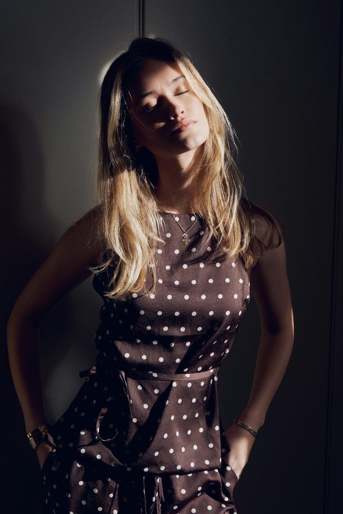 Ciemnobrązowy top marki Neo Noir w białe kropki. Top wykonany jest w 100% z poliestru i ma dopasowany krój.