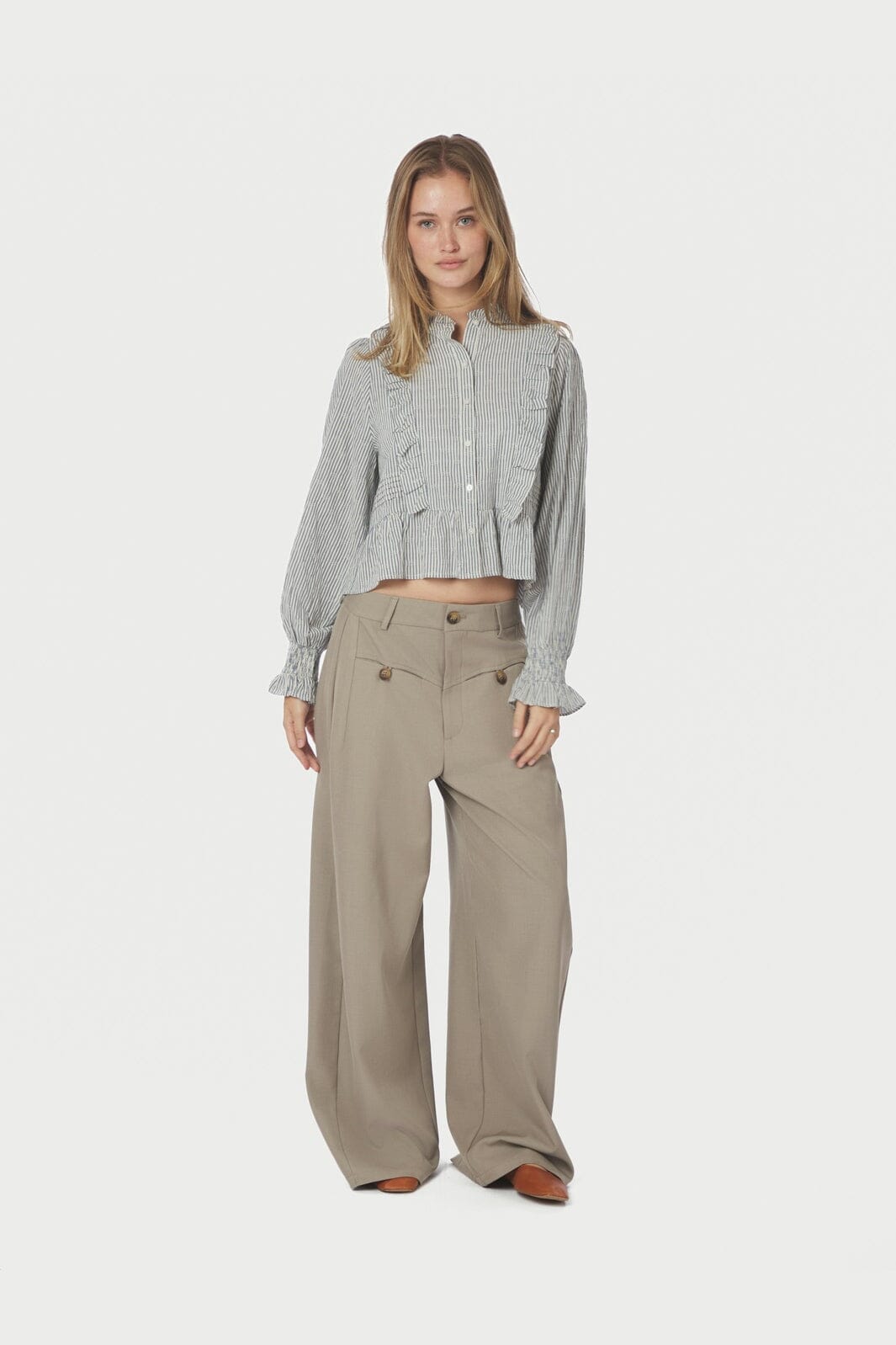 Bluzka w paski od Neo Noir, wykonana w 100% z bawełny. Bluzka ma pionowe paski w kolorze niebieskim, kremowym i białym oraz marszczone wykończenia.
