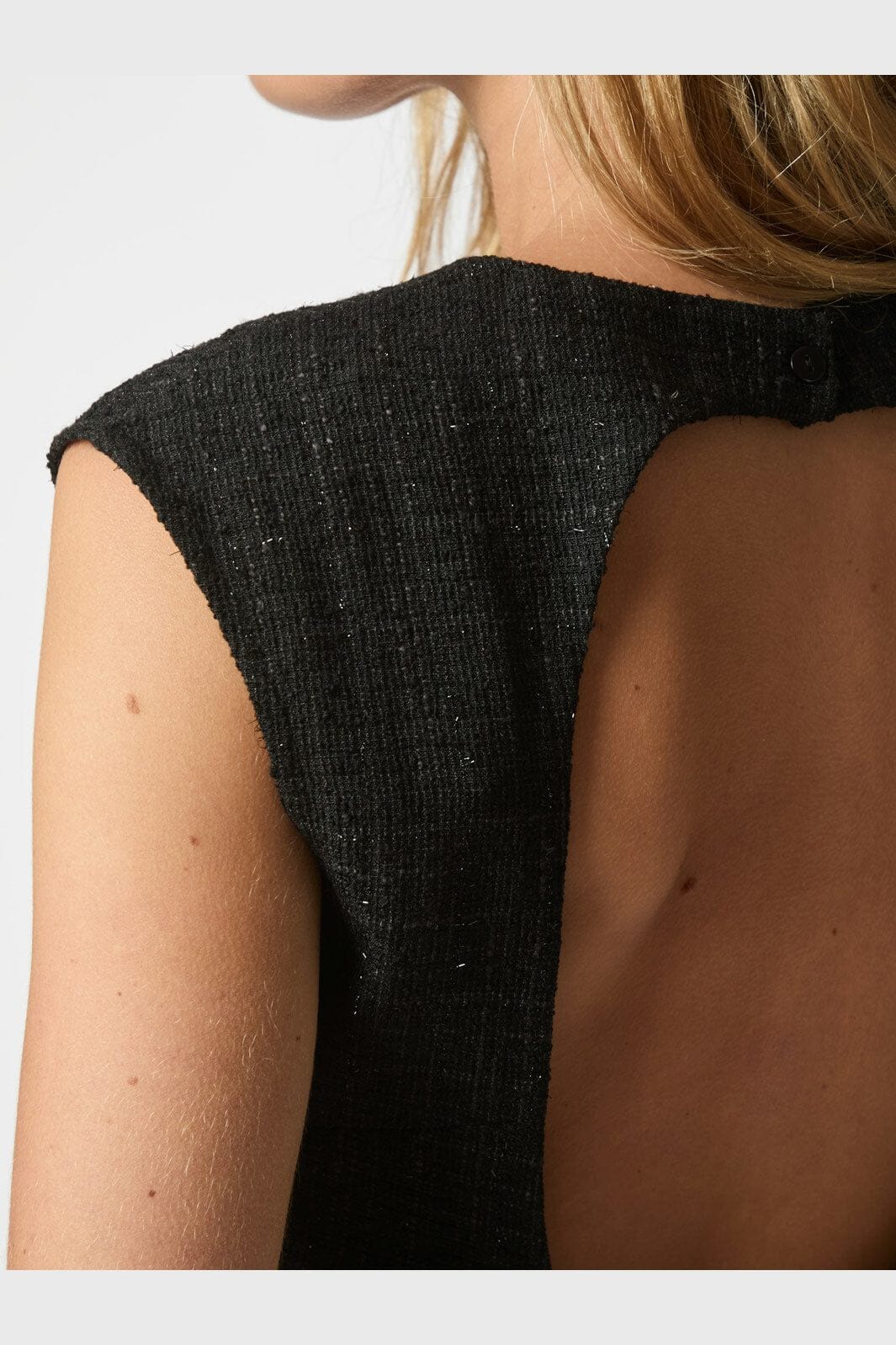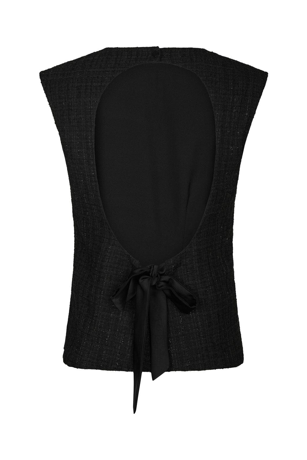 Czarny top boucle od Neo Noir z otwartym tyłem i wiązaniem. Top ma okrągły dekolt z guzikami i jest wykonany z materiału bouclé o interesującym wyrazie.