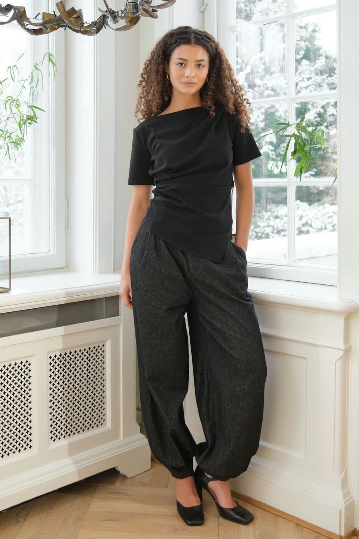 Czarna bluzka Neo Noir z miękkiej mieszanki poliestru, modalu i elastanu. Bluzka ma drapowanie z przodu oraz asymetryczny dół.