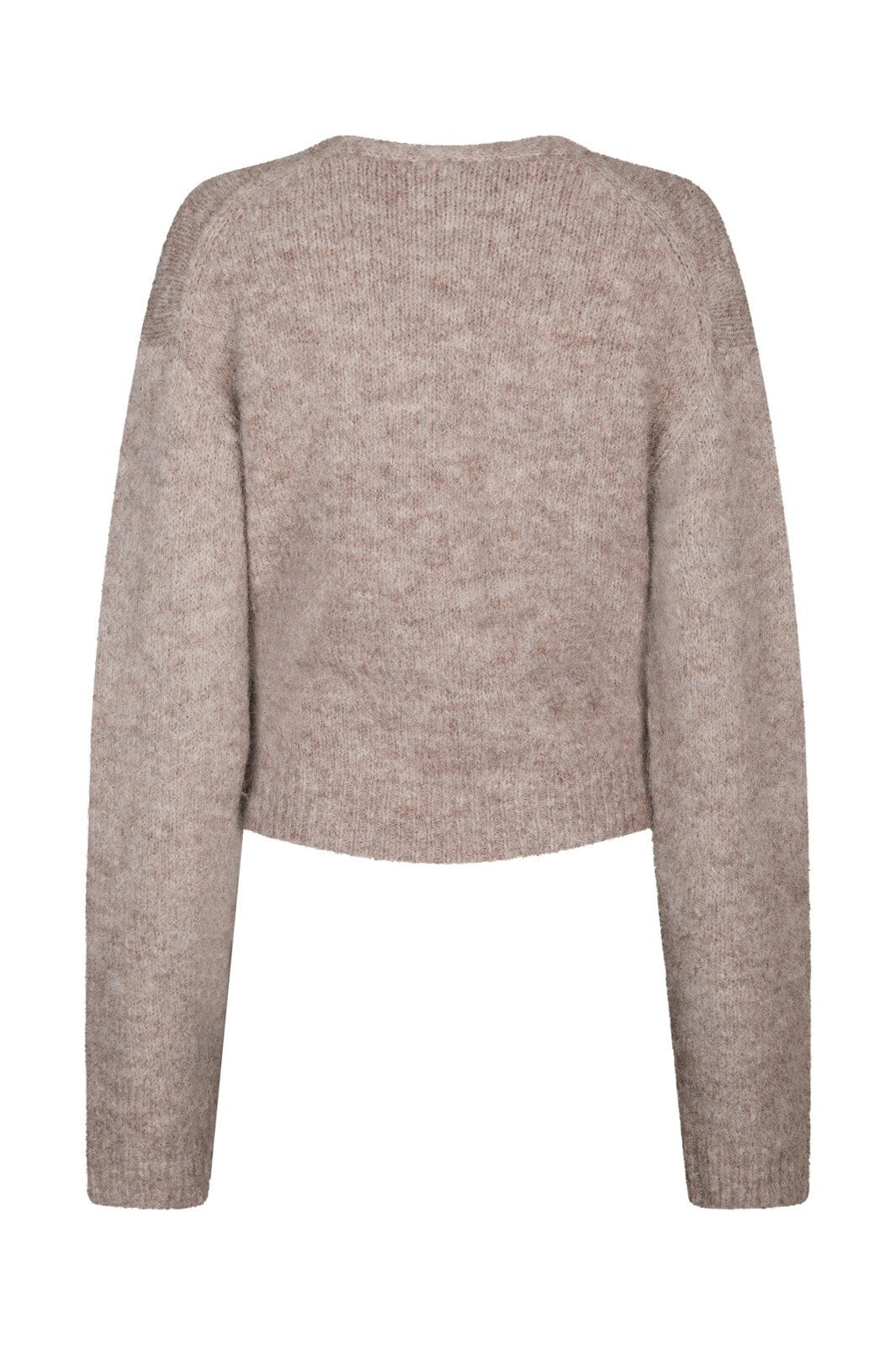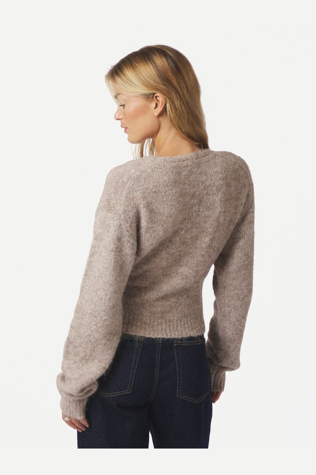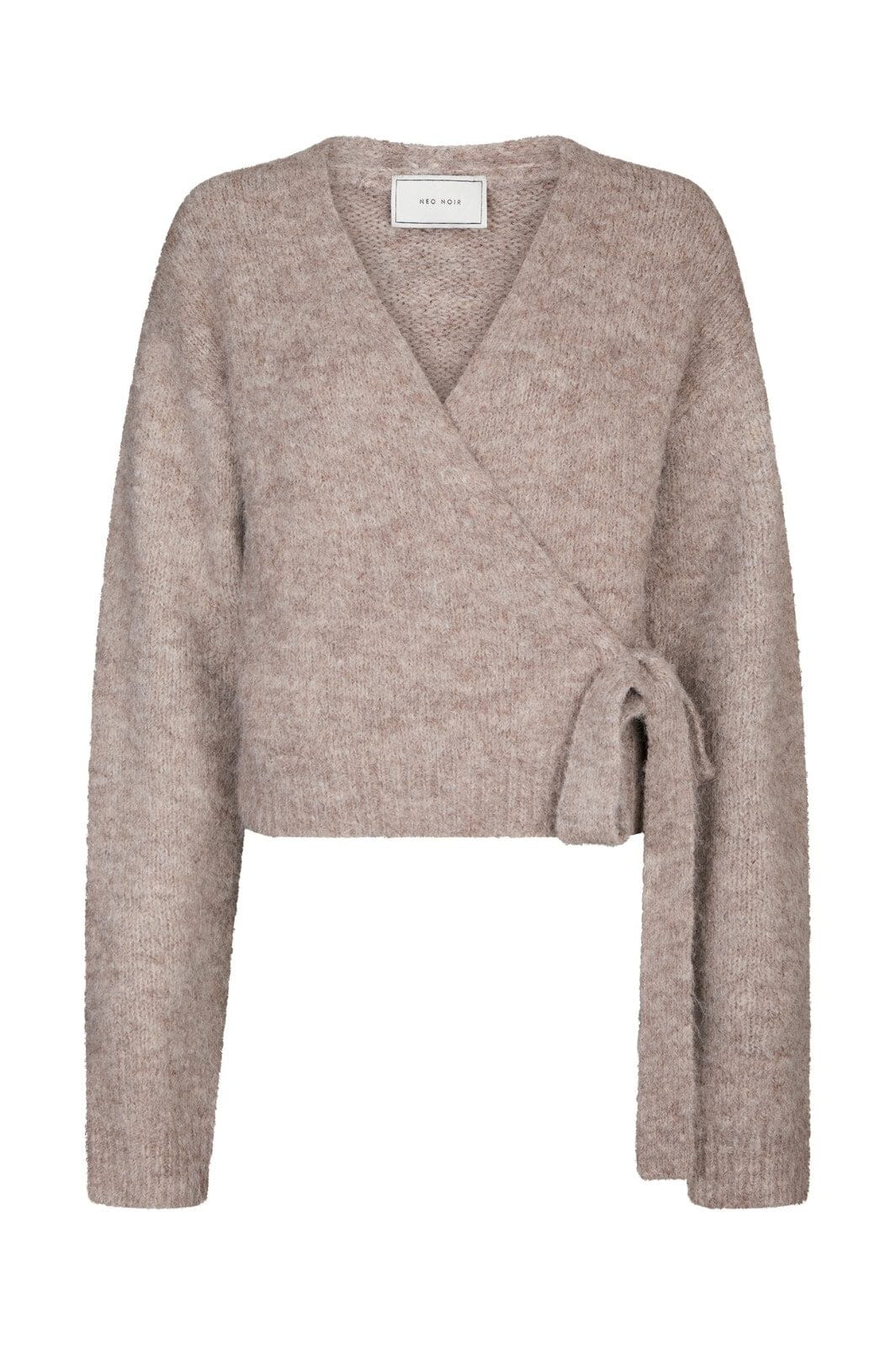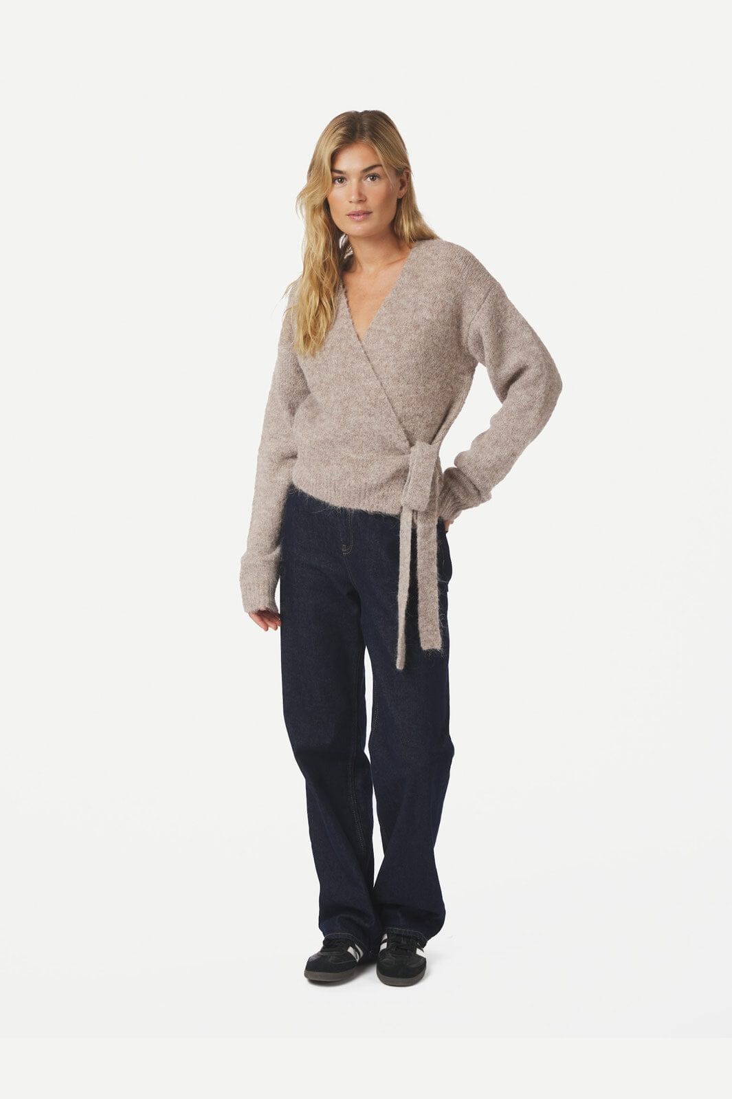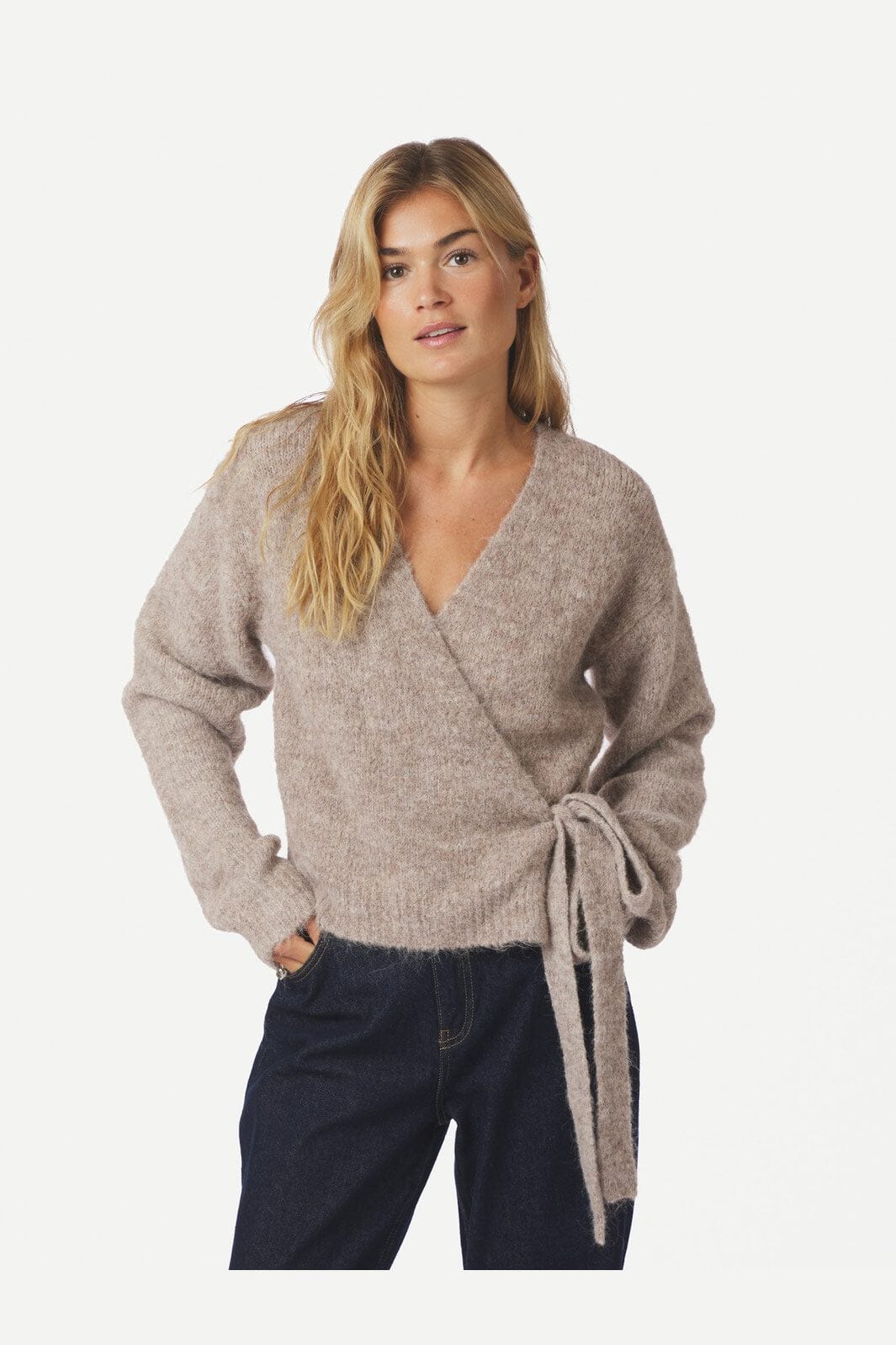 Sweter z dzianiny od Neo Noir w beżowym melanżu. Miękki sweter z projektem w stylu wrap i wiązaniem w talii. Ma dekolt w serek i długie rękawy.