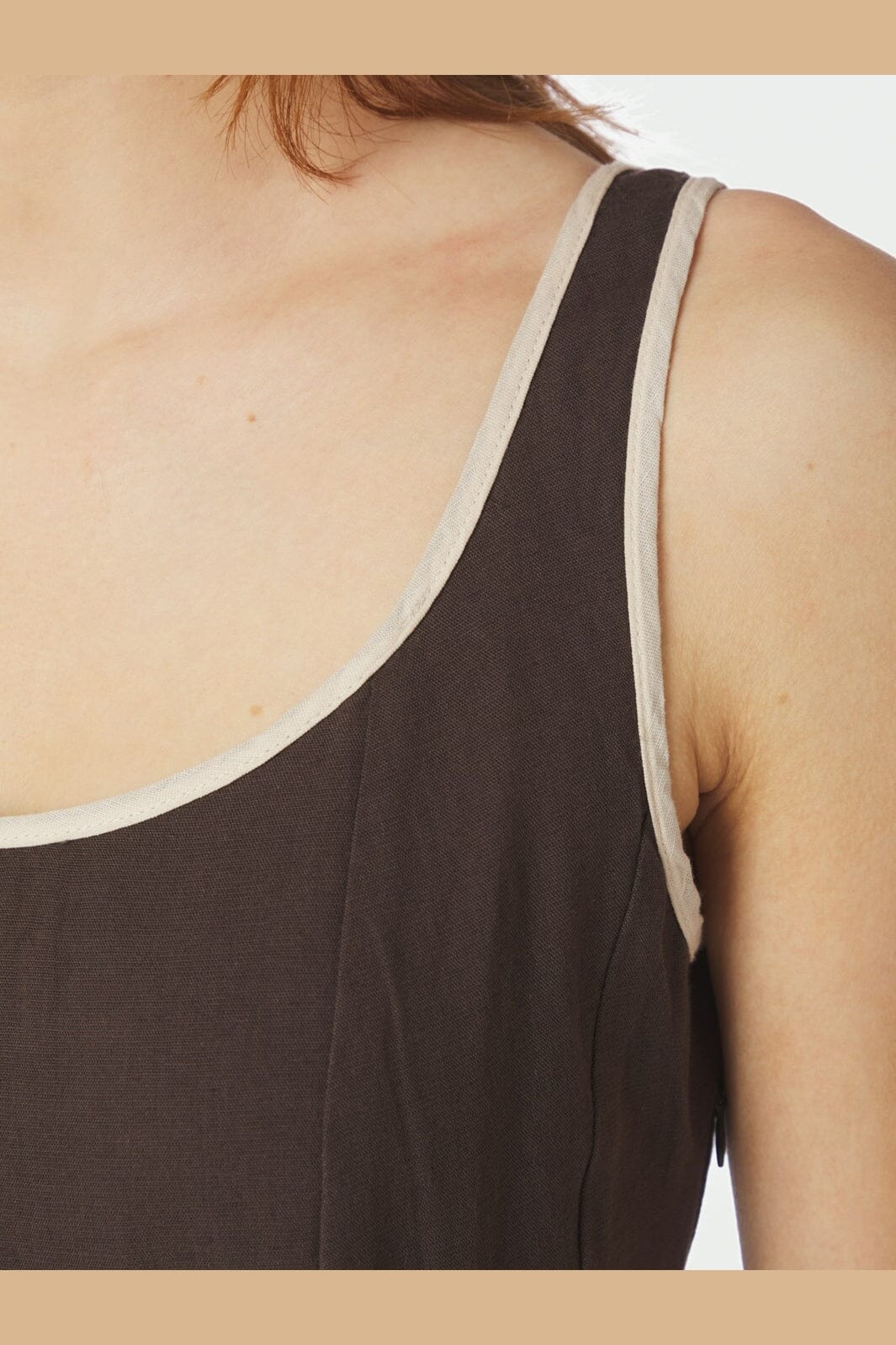 Ciemnobrązowa sukienka marki Neo Noir, wykonana z mieszanki bawełny i lnu. Sukienka ma ramiączka i kwadratowy dekolt.