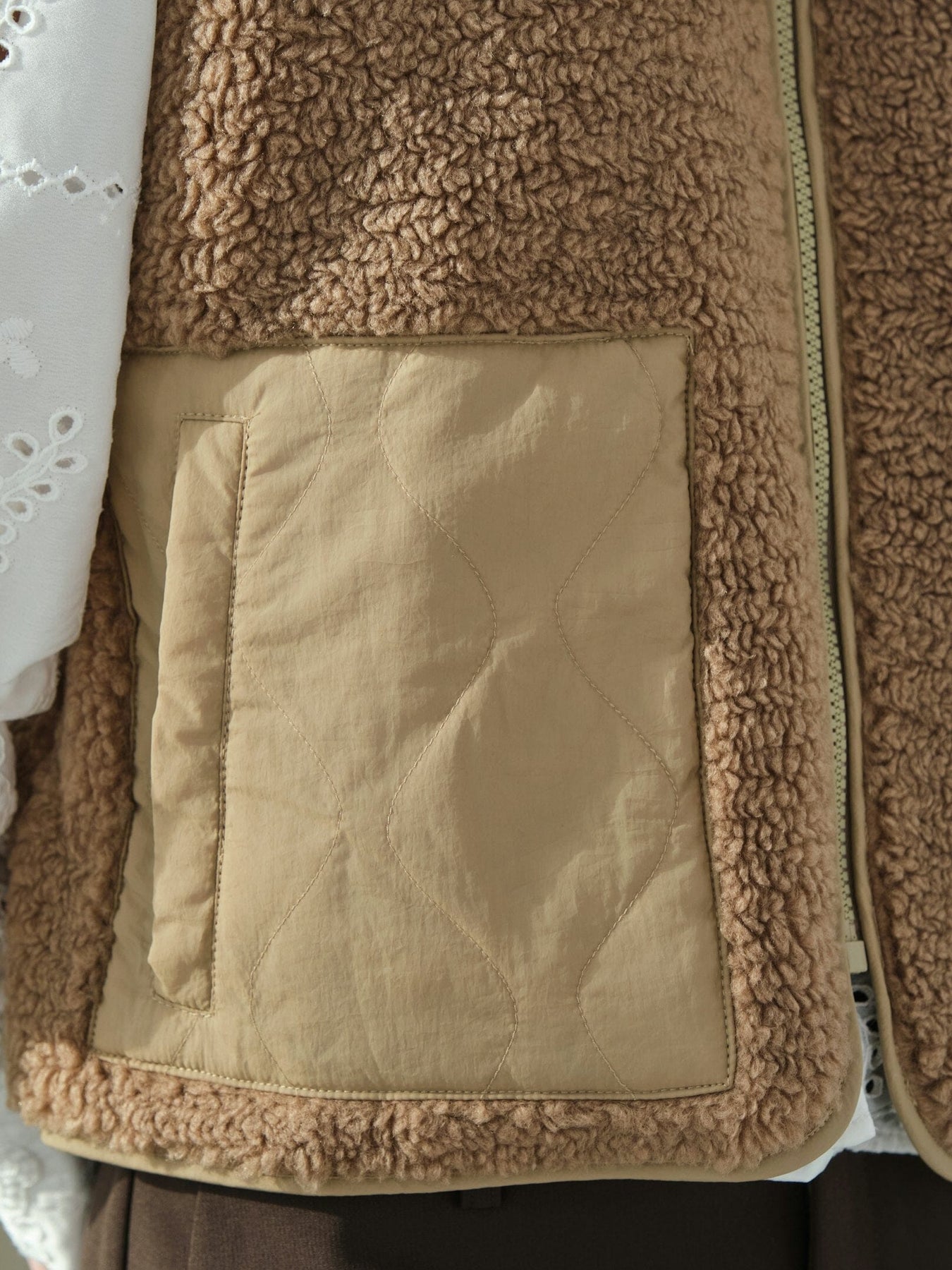 Bezrękawnik od Neo Noir, wykonany z miękkiego materiału typu teddy w brązowo-beżowym odcieniu. Kamizelka ma wysoki kołnierz i zamek z przodu oraz kontrastowe kieszenie.