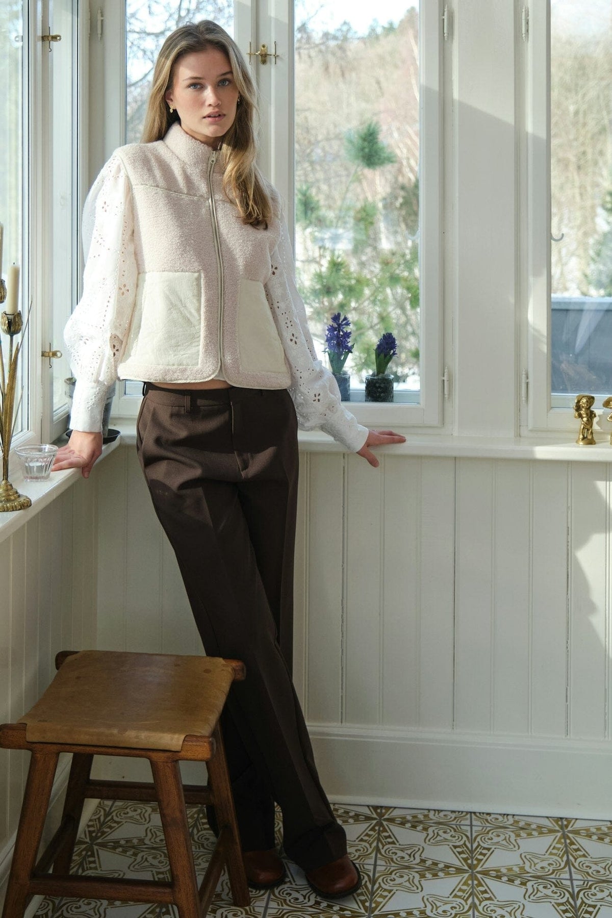 Bezrękownik od Neo Noir z miękkiego materiału typu teddy w jasnym, kości słoniowej kolorze. Kamizelka pasuje do swobodnych, domowych stylizacji i ma dwie duże kieszenie z przodu.