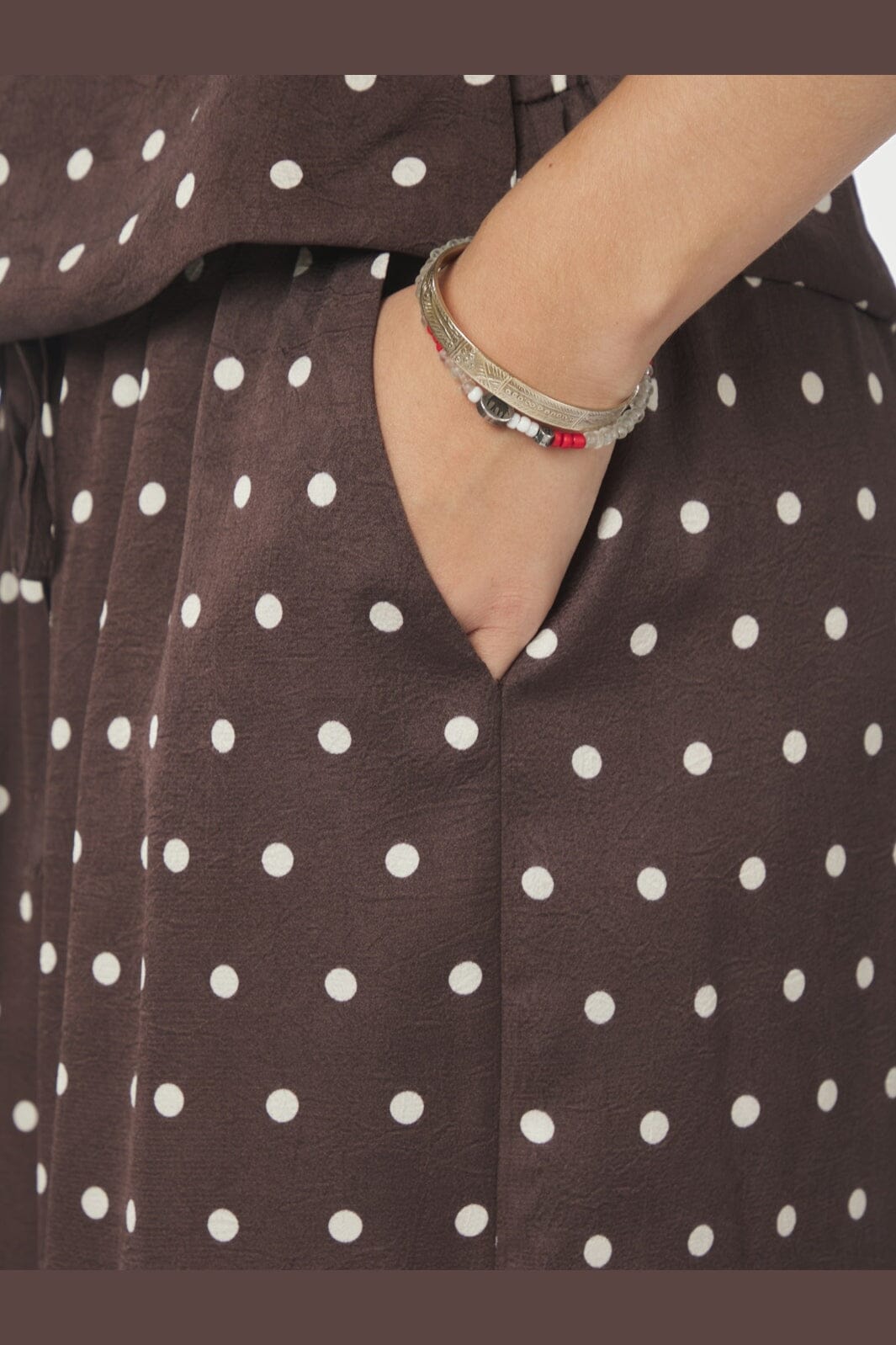 Ciemnobrązowe spodnie Neo Noir w białe kropki. Wykonane w 100% z poliestru, o luźnym kroju i długości do podłogi.