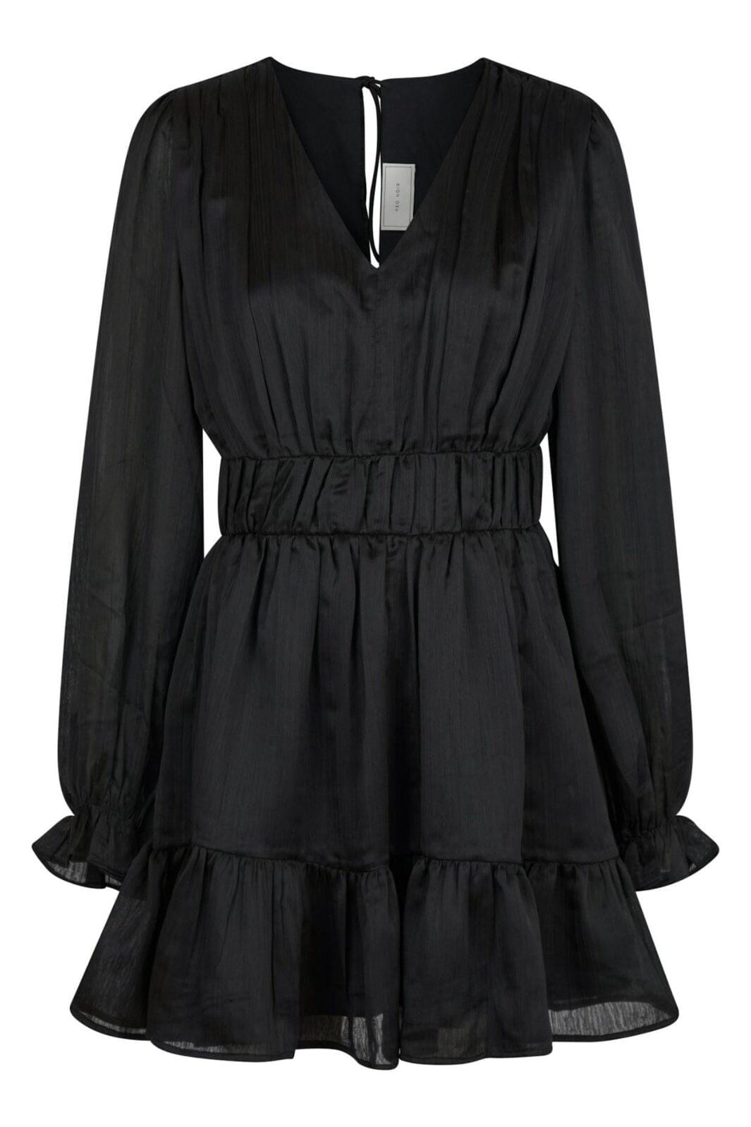 Czarna sukienka od Neo Noir z dekoltem w kształcie V i długimi rękawami. Sukienka ma zbieraną talię z falbanką i wiązanie, które nadaje jej kobiecy wyraz.