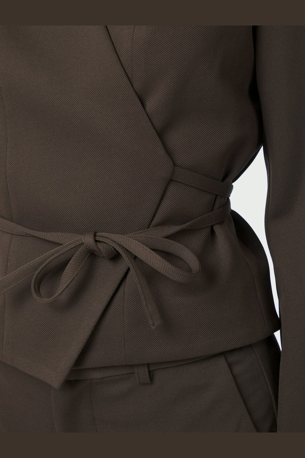 Ciemnobrązowa bluzka od Neo Noir z fasonem kopertowym. Bluzka ma dekolt w kształcie litery V i długie rękawy. Wiązanie w talii pozwala na dostosowanie fasonu.