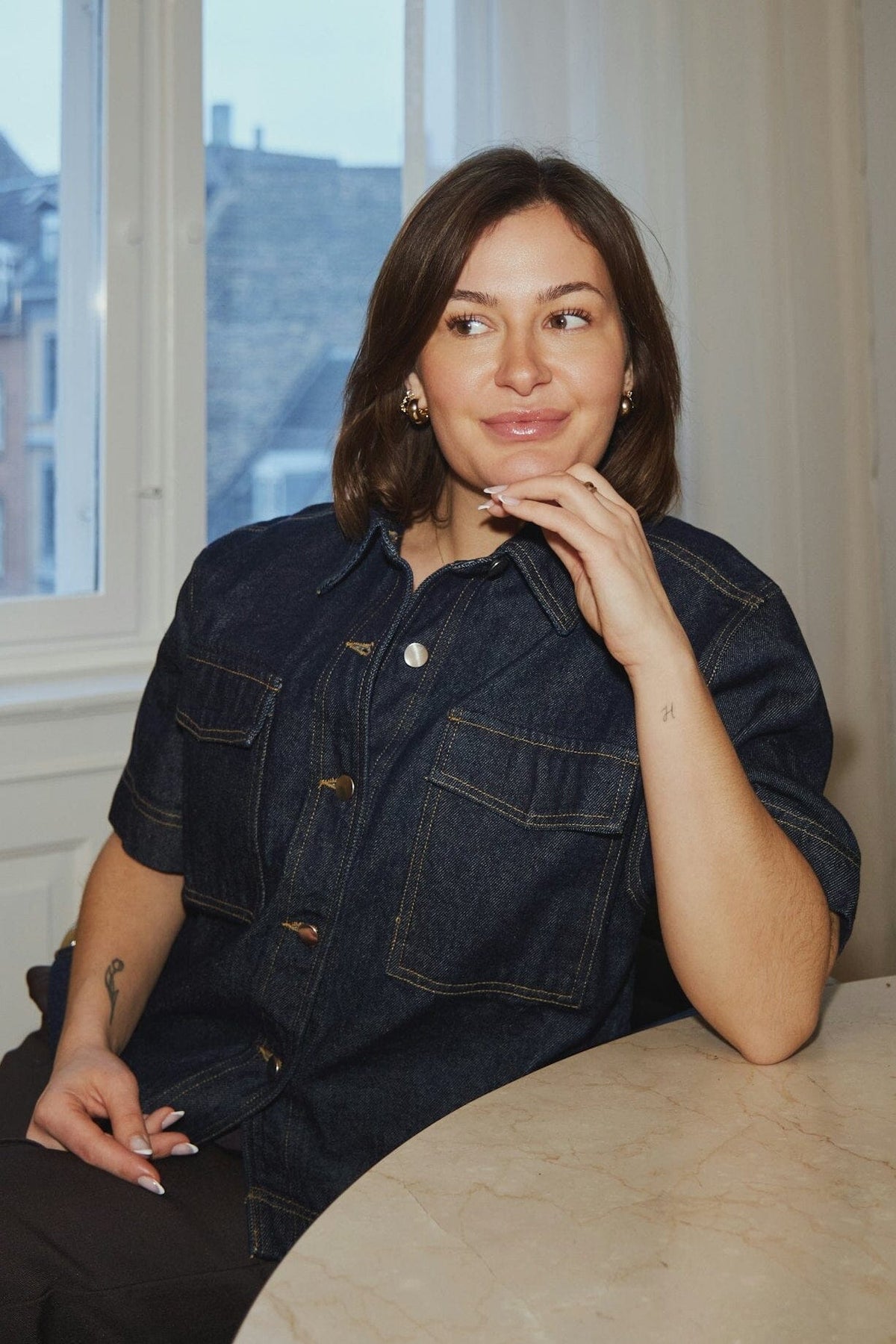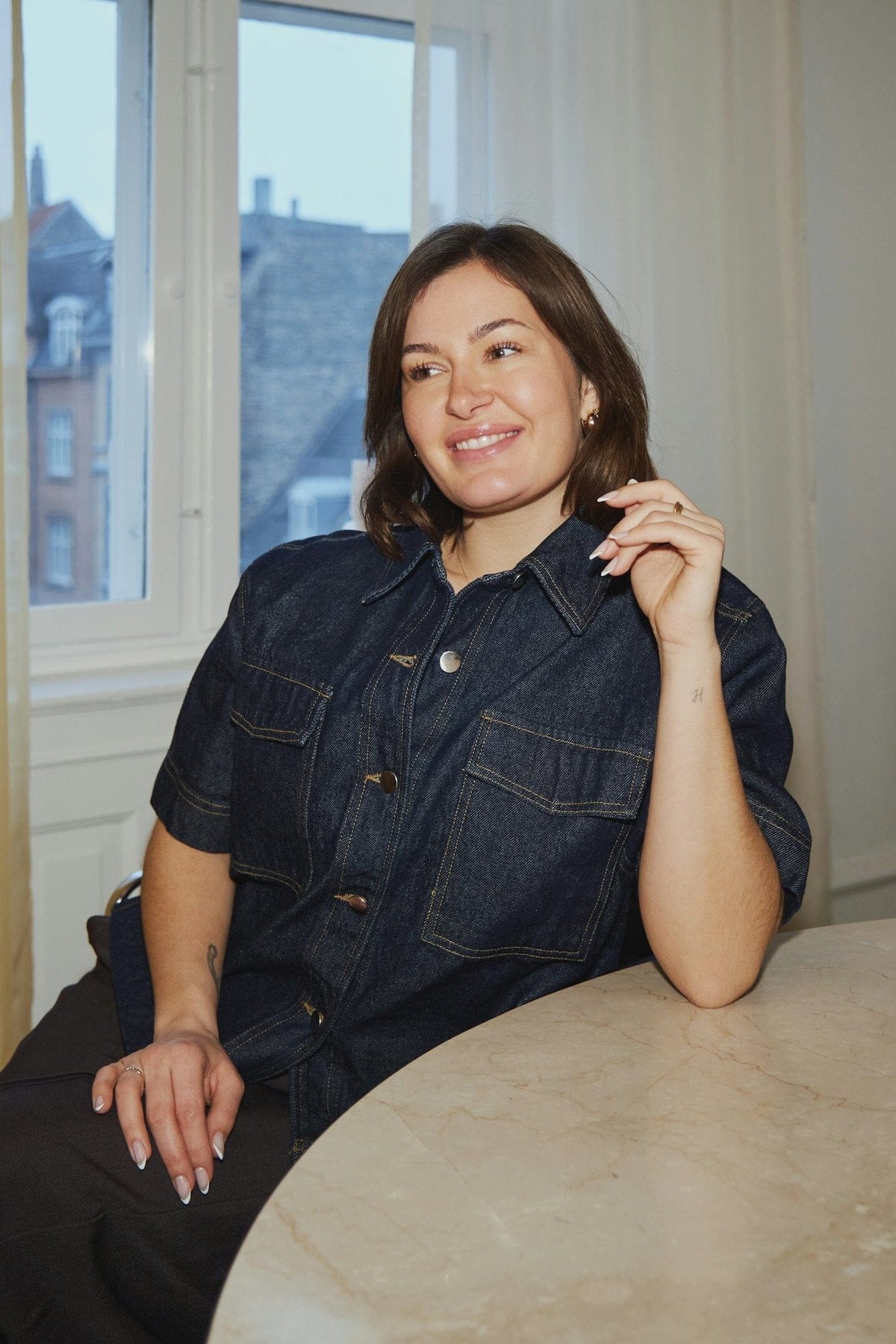 Ciemnoniebieska koszula dżinsowa od Neo Noir. Koszula ma krótkie rękawy oraz klasyczny kołnierzyk koszulowy z zapięciem na guziki z przodu.