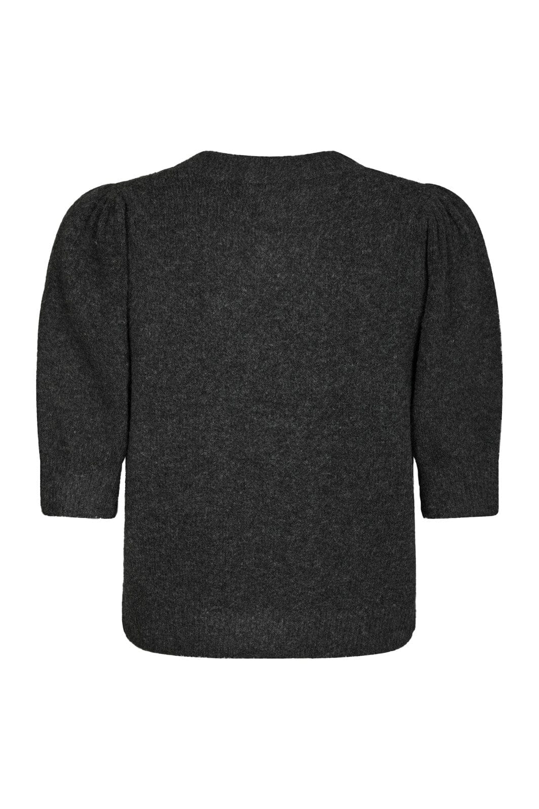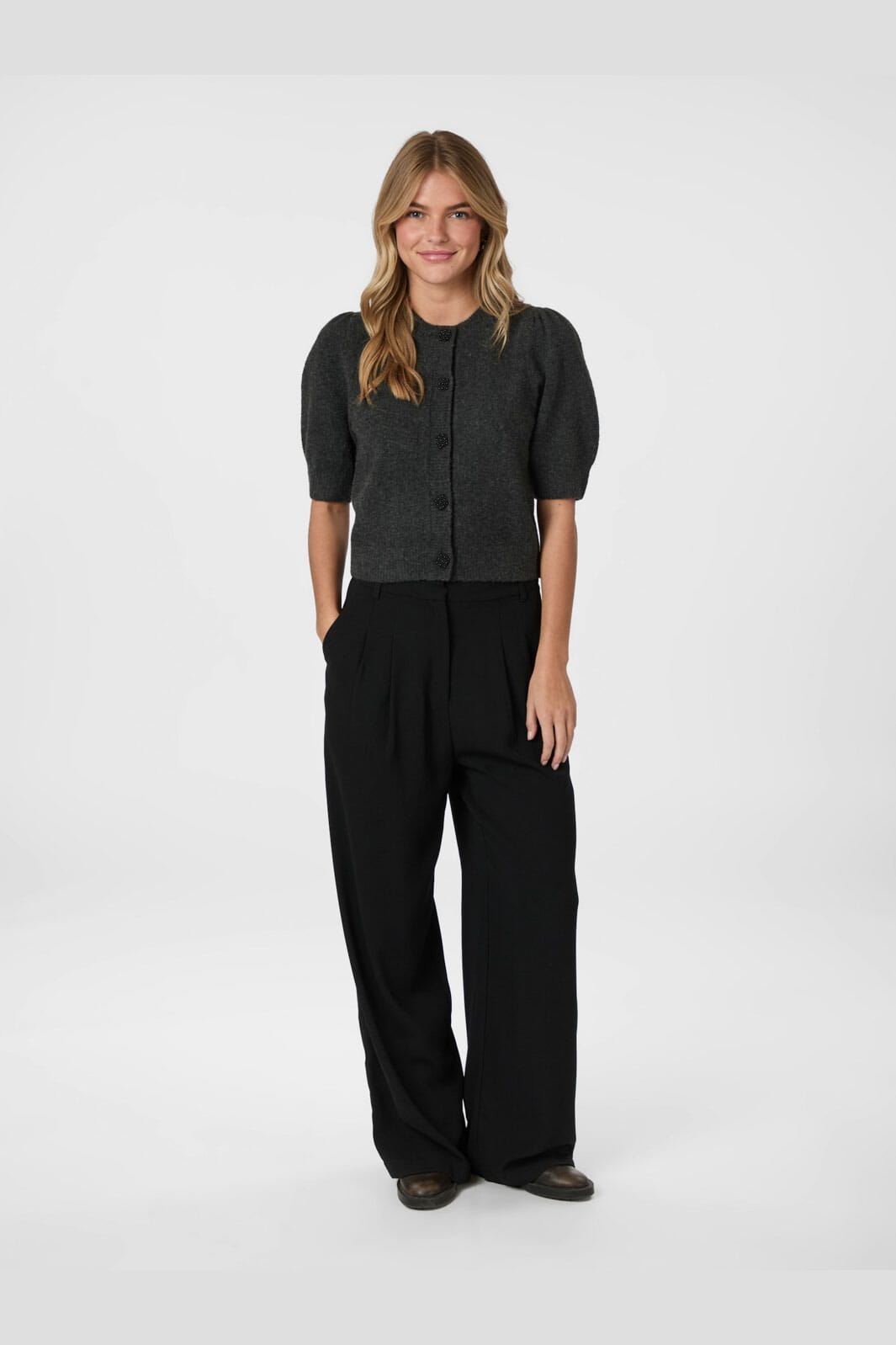 Sweter kardigan od Neo Noir w melanżu antracytowym. Ma krótkie bufiaste rękawy i okrągły dekolt z rzędem małych guzików z cekinami z przodu, które nadają subtelny akcent.