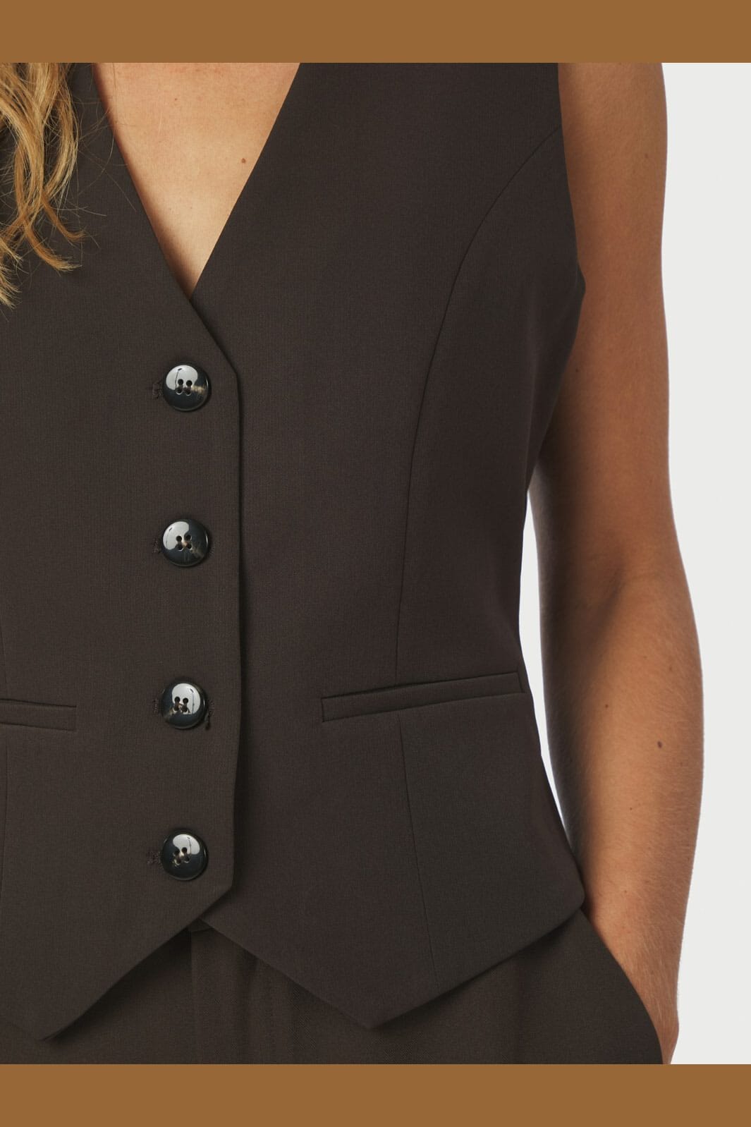 Ciemnobrązowa kamizelka od Neo Noir z dopasowanym krojem i dekoltem w kształcie V. Kamizelka ma pięć guzików z przodu i dwie boczne kieszenie. Można ją stylizować z pasującymi spodniami.