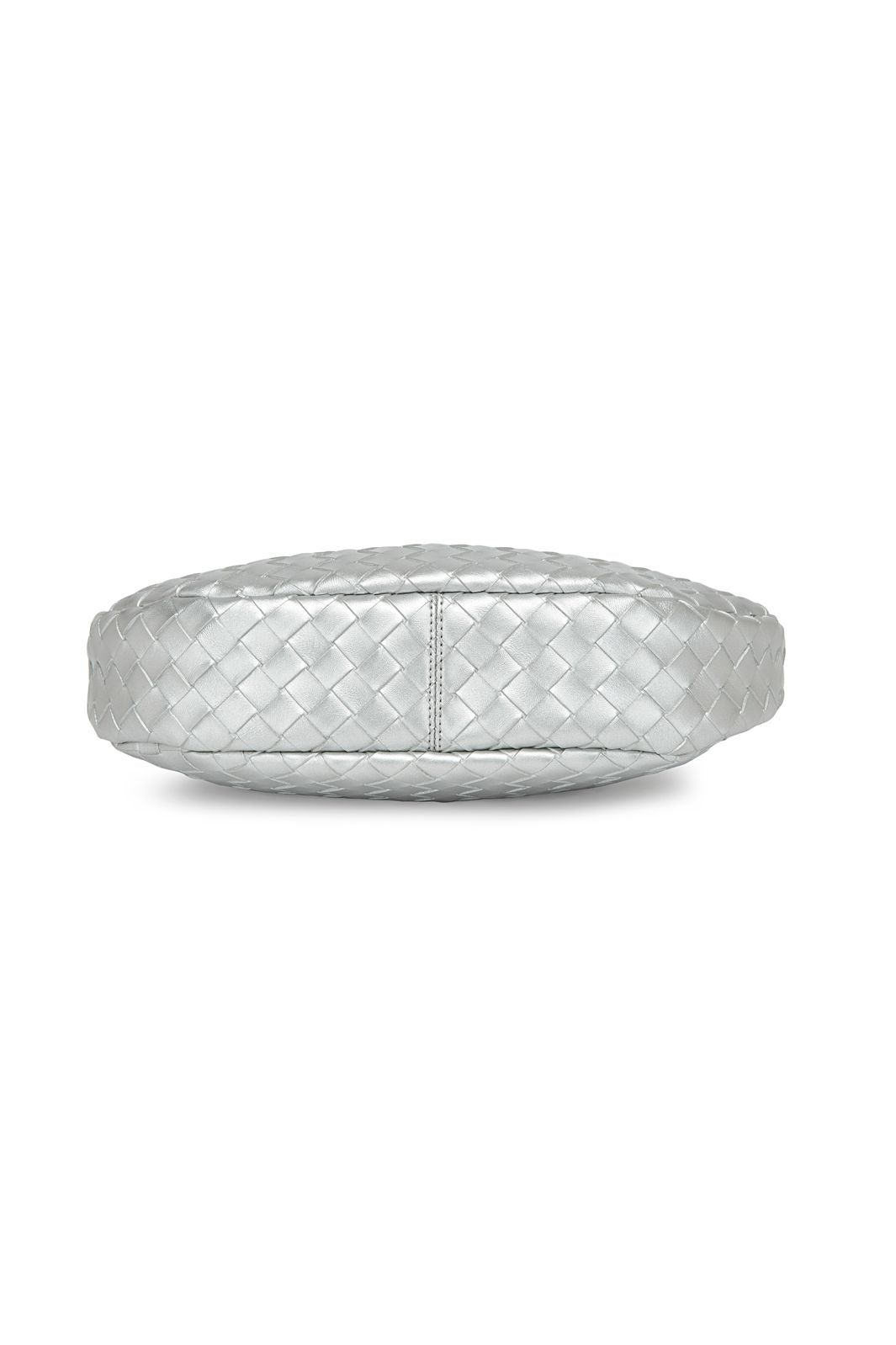Srebrna torebka na ramię od Noella z plecioną fakturą i płaskim kształtem półksiężyca. Torebka wykonana jest z poliuretanu i ma detale w kolorze szczotkowanego srebra.
