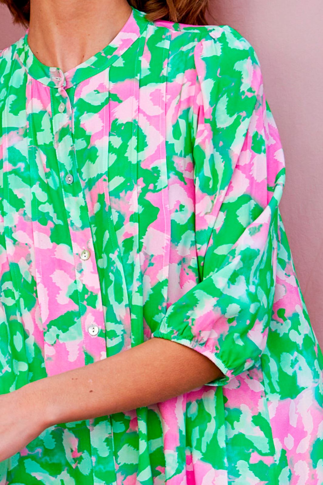 Sukienka koszulowa od Noella w zielonym i różowym kolorze z abstrakcyjnym wzorem kamuflażu. Sukienka ma zapięcie na guziki z przodu oraz kołnierz koszulowy z rękawami 3/4.