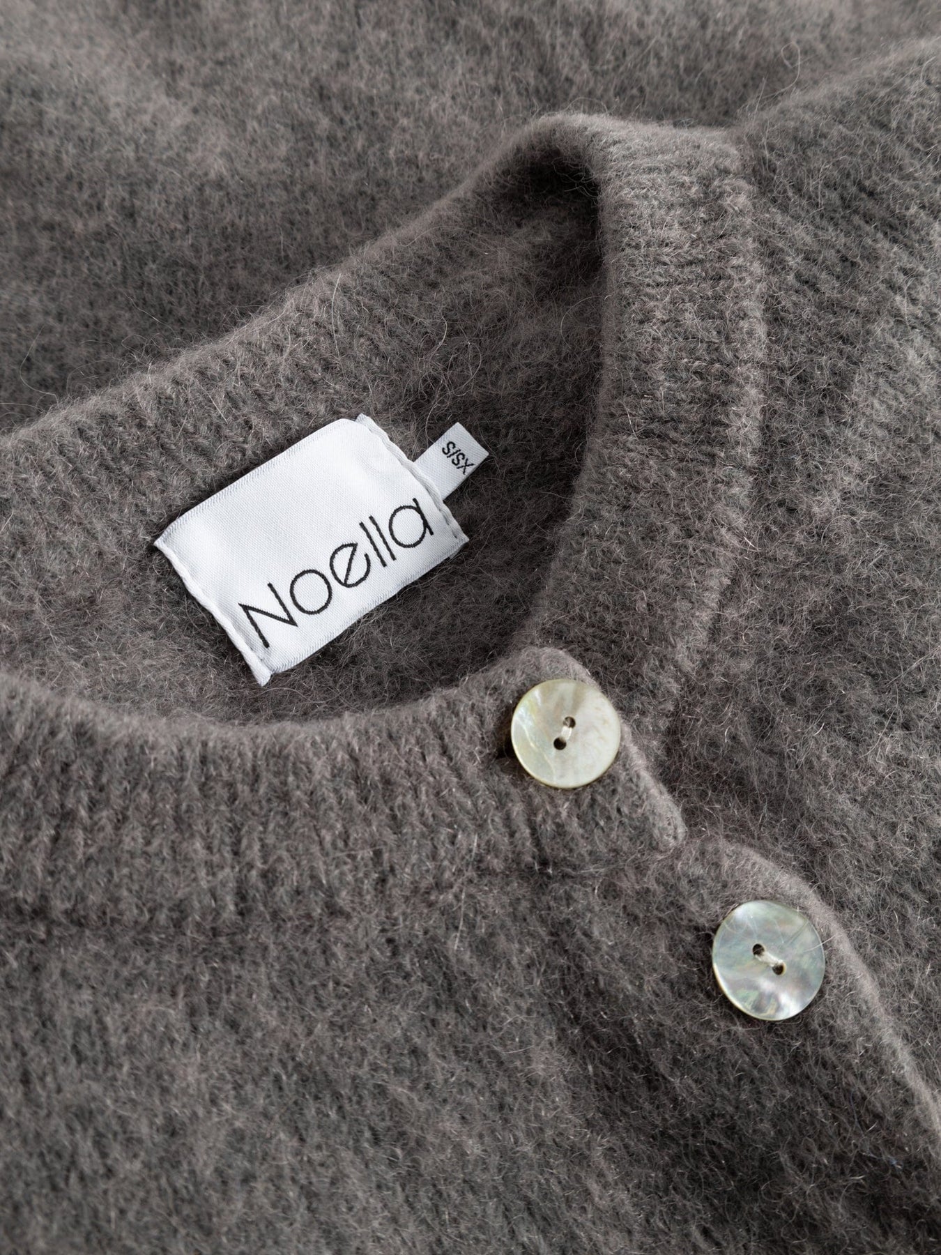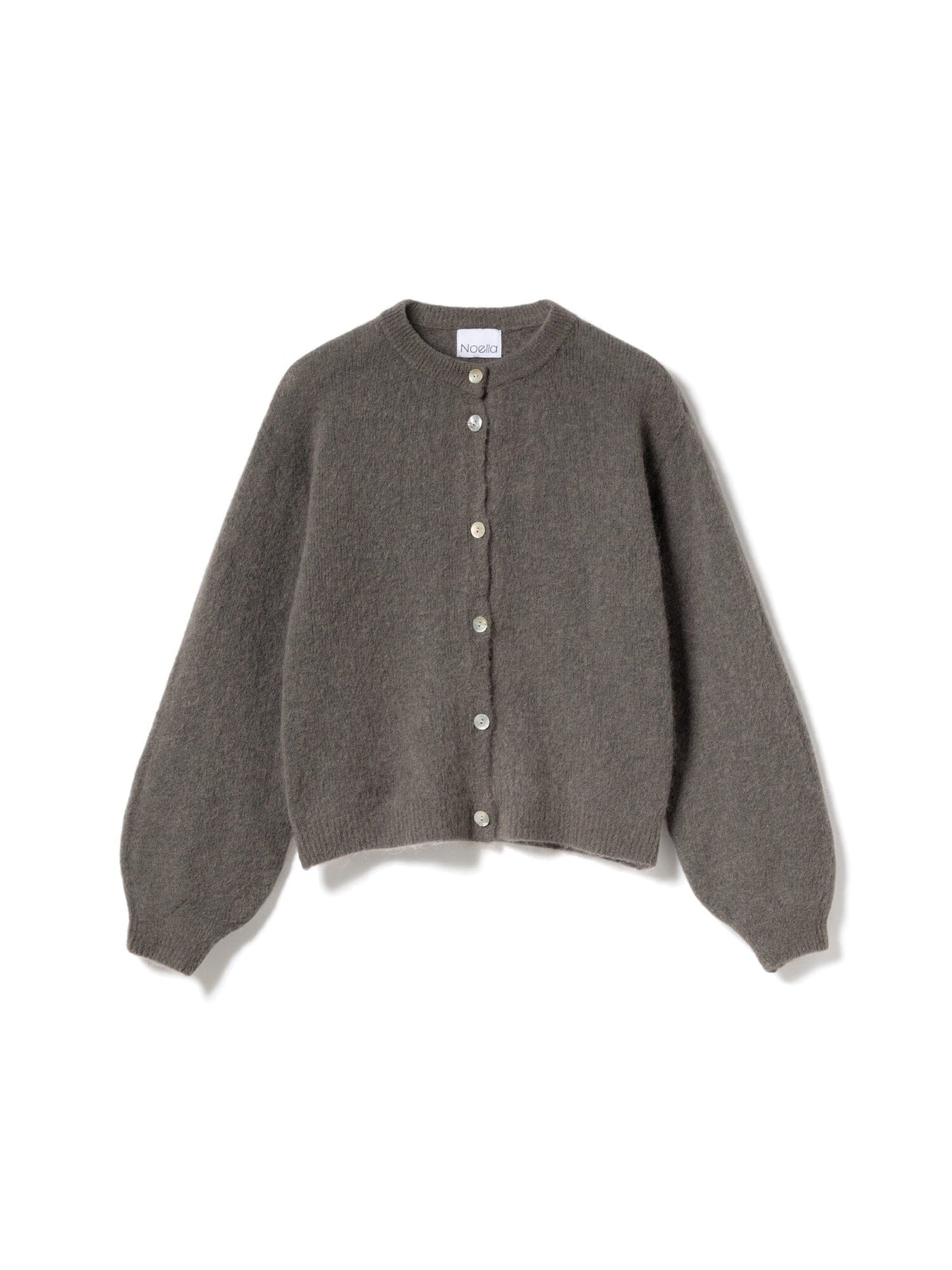 Sweter kardigan od Noella w kolorze kawowym. Ma okrągły dekolt, guziki z przodu i szerokie rękawy z lekkim bufkiem. Materiał jest miękki i puszysty, dając ciepłe uczucie.
