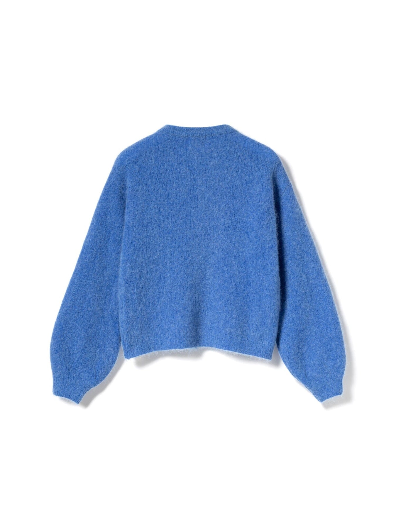 Sweter kardigan od Noella w jasnoniebieskim odcieniu. Ma okrągły dekolt i zapięcie na guziki z przodu z jasnymi guzikami. Balonowe rękawy i krótka długość nadają kardiganowi wyjątkowy charakter.
