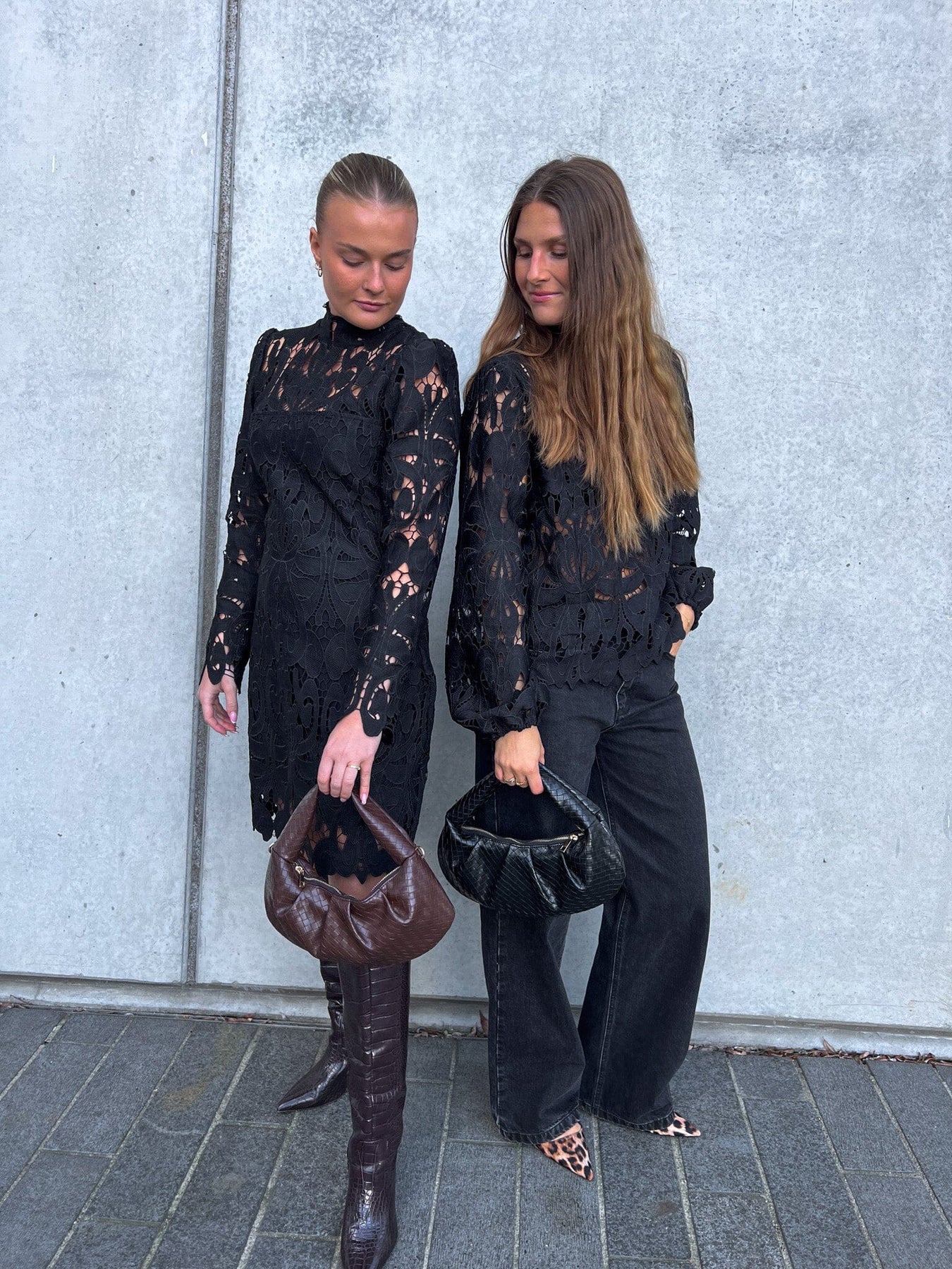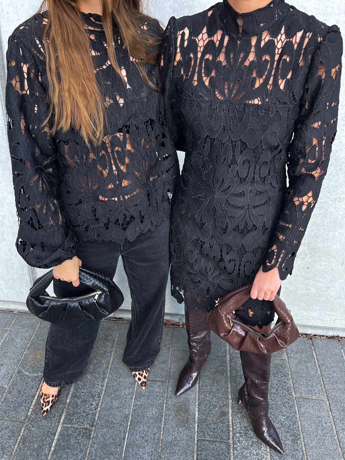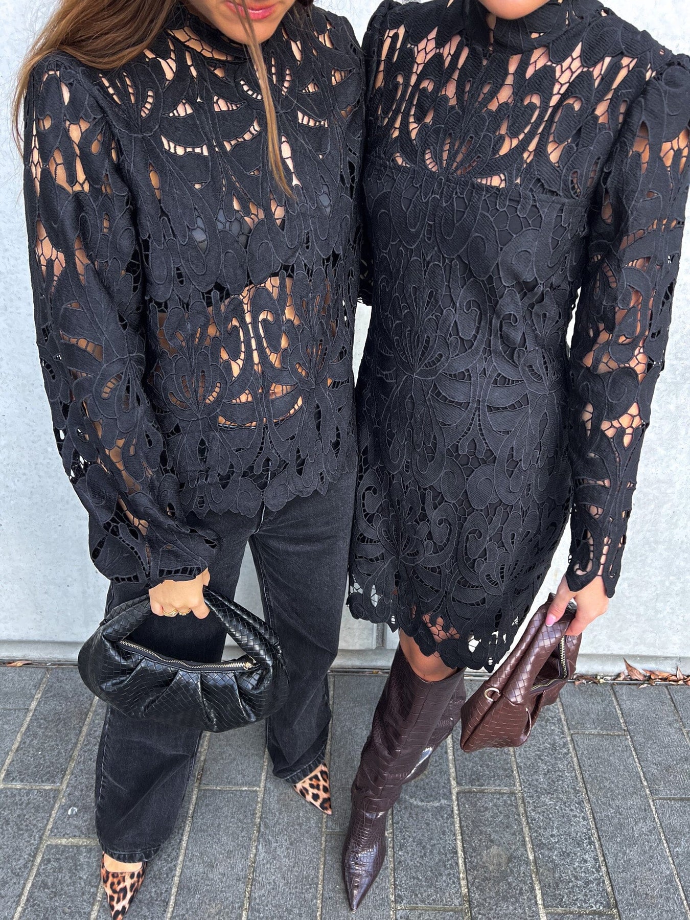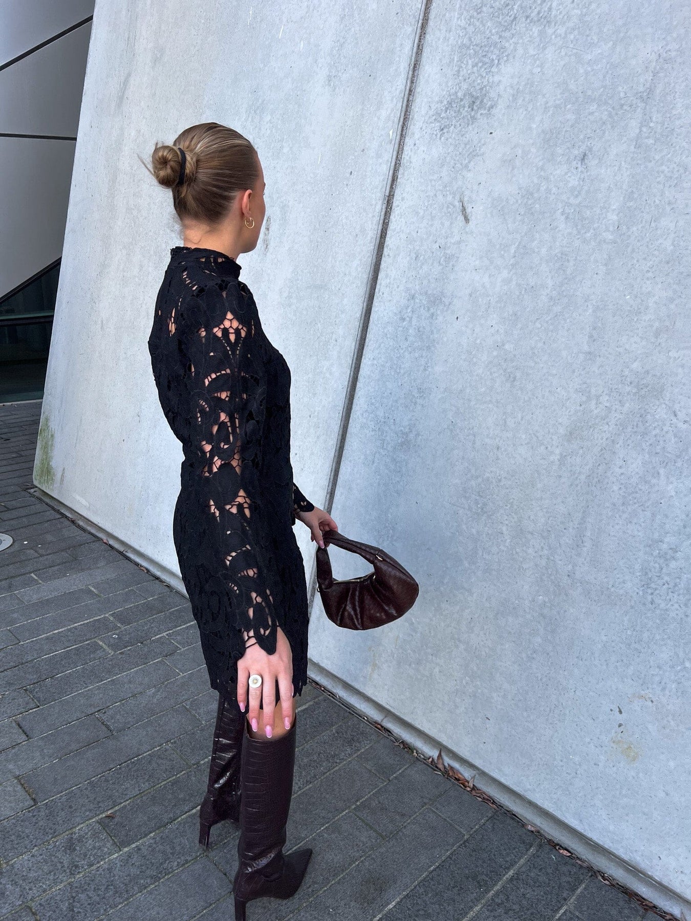 Czarna sukienka koronkowa od Noella z wysokim kołnierzem i długimi rękawami. Sukienka ma ciągły wzór koronkowy i sięga do połowy uda.