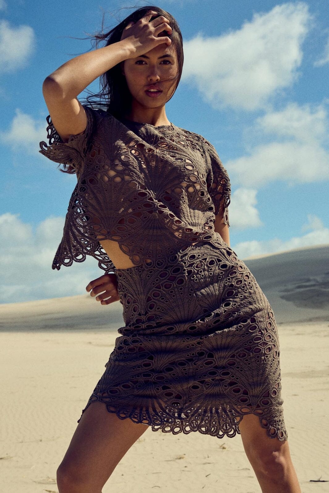 Brąskowa koronkowa spódnica od Noella z kwiatowym wzorem. Spódnica o wysokim stanie ma krótki fason i szczegółowy projekt koronki z wycięciami, które tworzą piękny wzór.