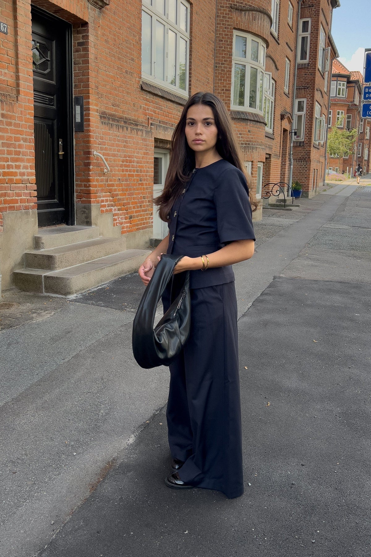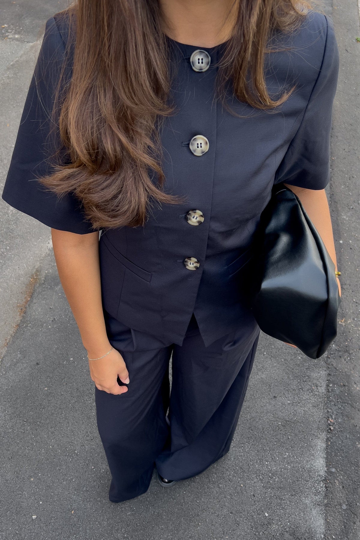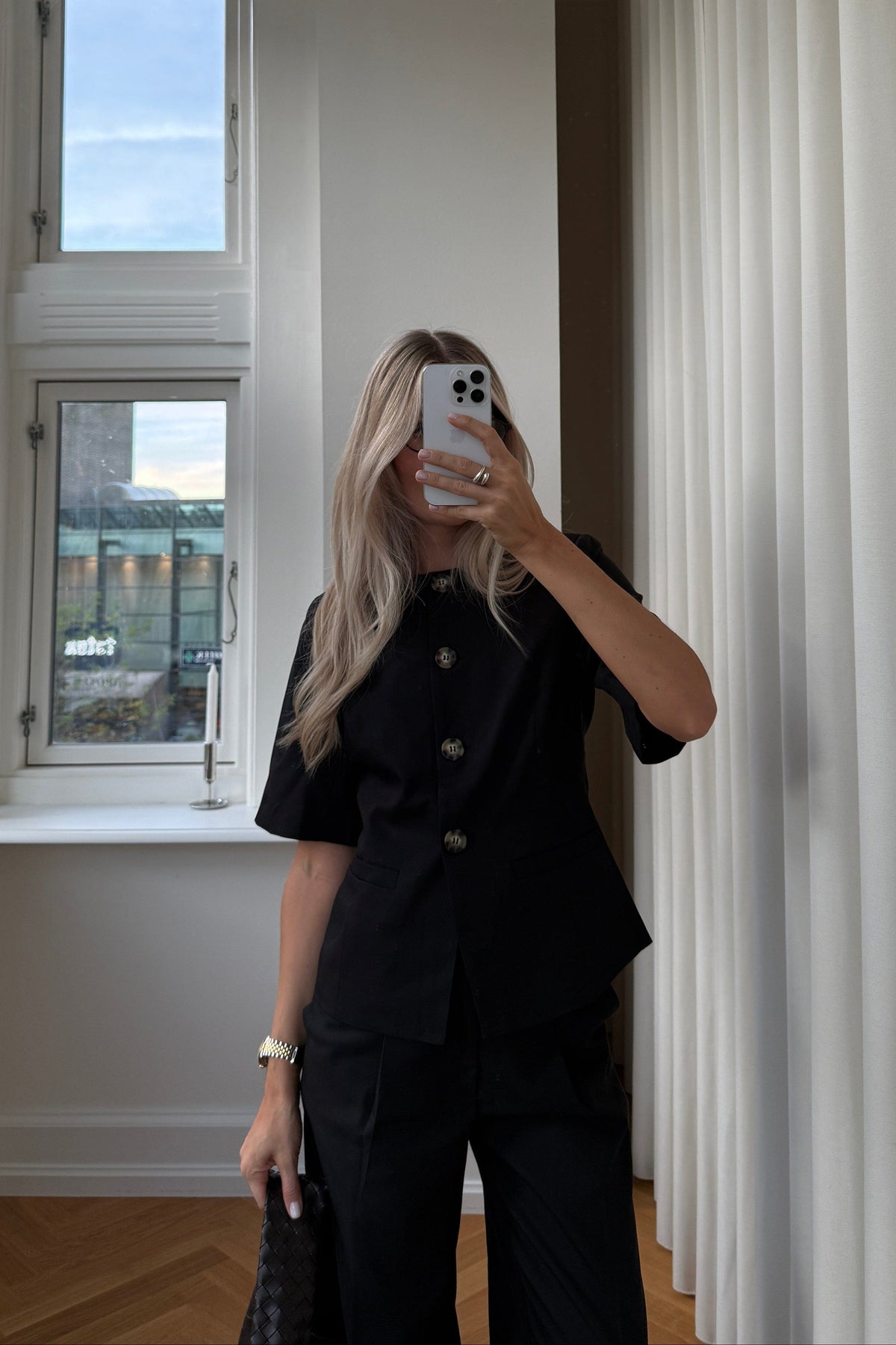 Czarna marynarka od Noella z krótkimi rękawami i okrągłym dekoltem. Duże guziki zdobią przód, a dwie boczne kieszenie nadają marynarce praktyczny design.