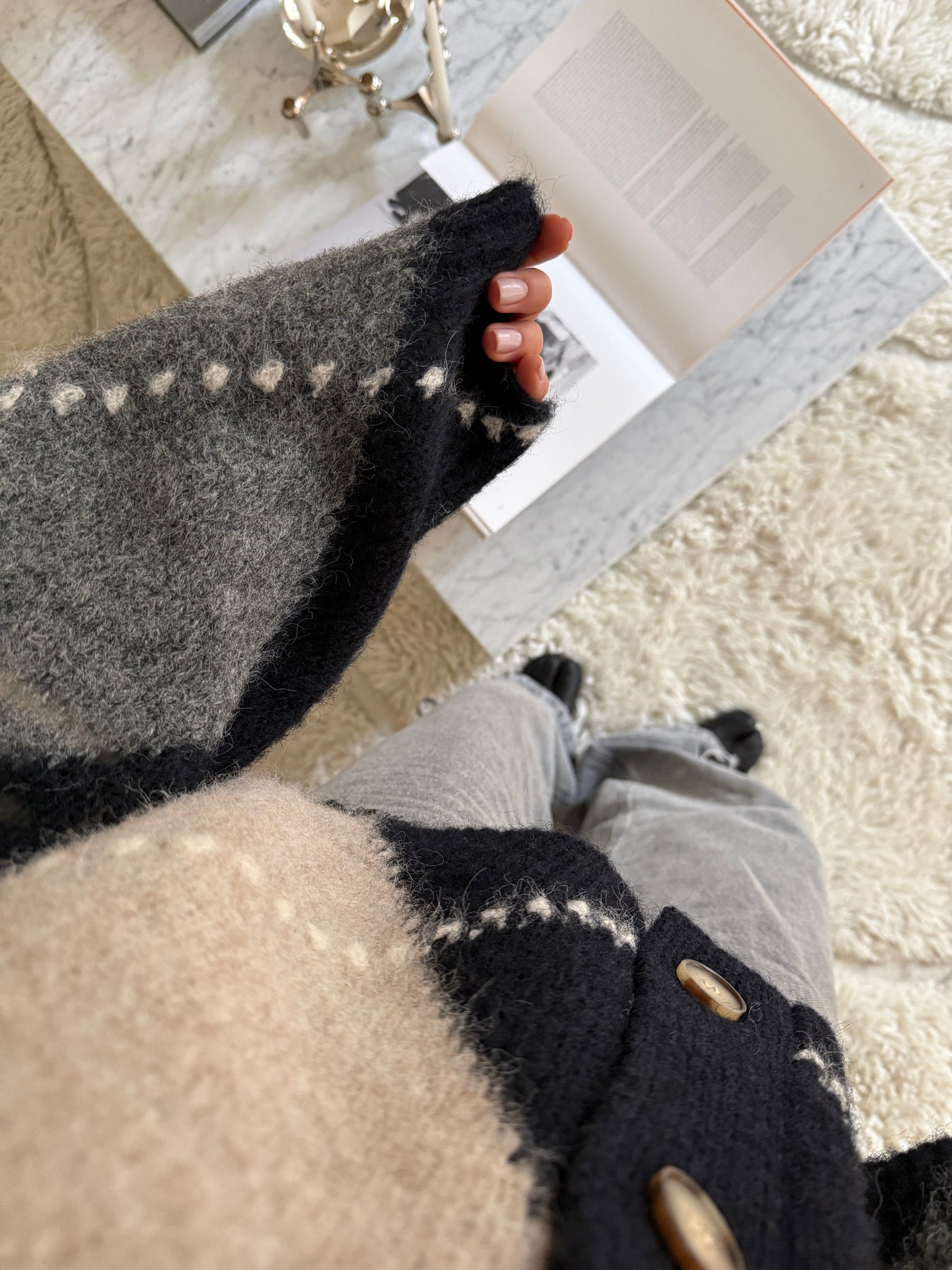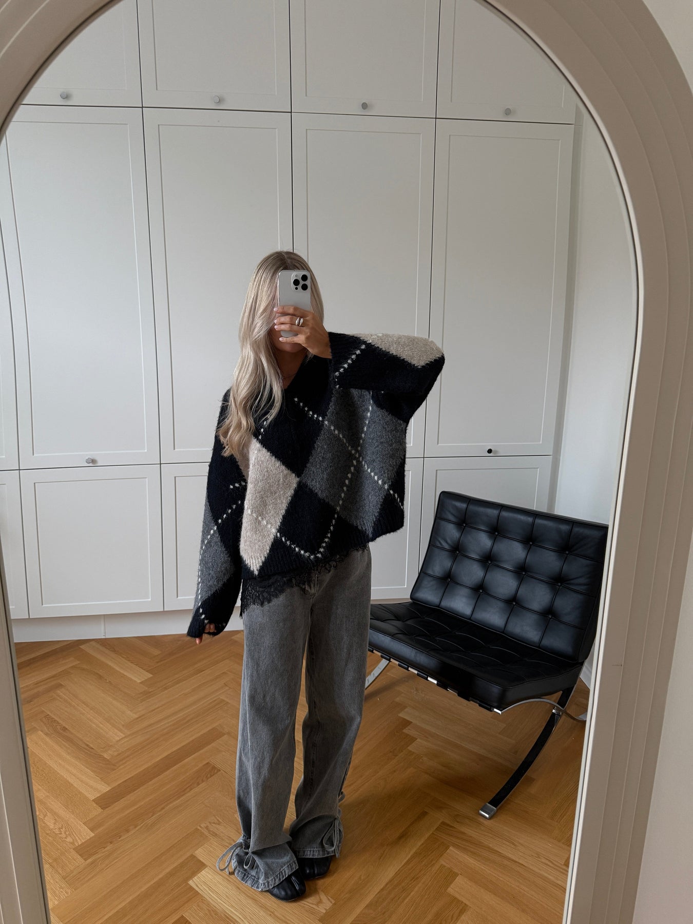Sweter od Noella z dużymi diamentowymi wzorami w ciemnoniebieskim, szarym i beżowym kolorze. Ma dekolt w serek i długie rękawy o luźnym kroju.
