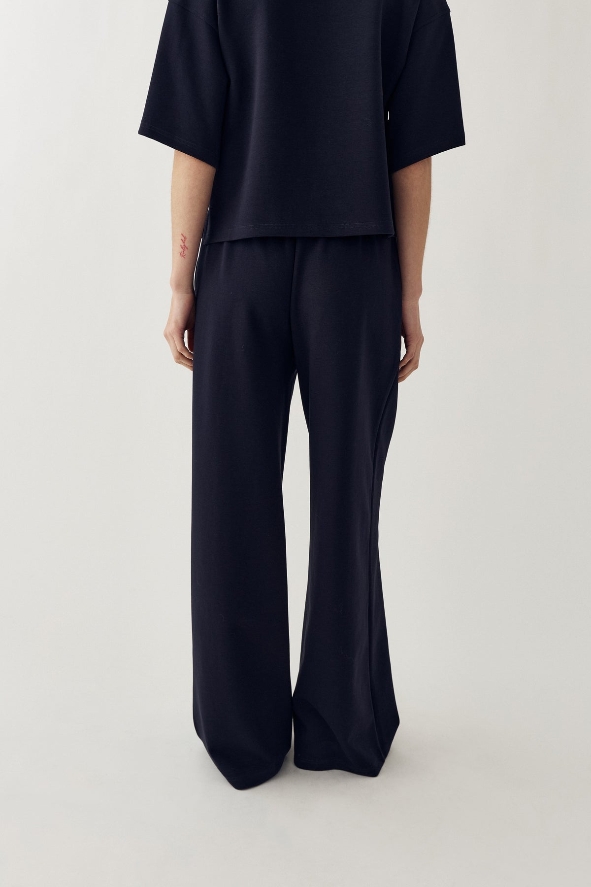 Spodnie Noella w ciemnoniebieskim kolorze. Spodnie mają szeroki krój nogawek oraz elastyczny pas z falbankowymi detalami.